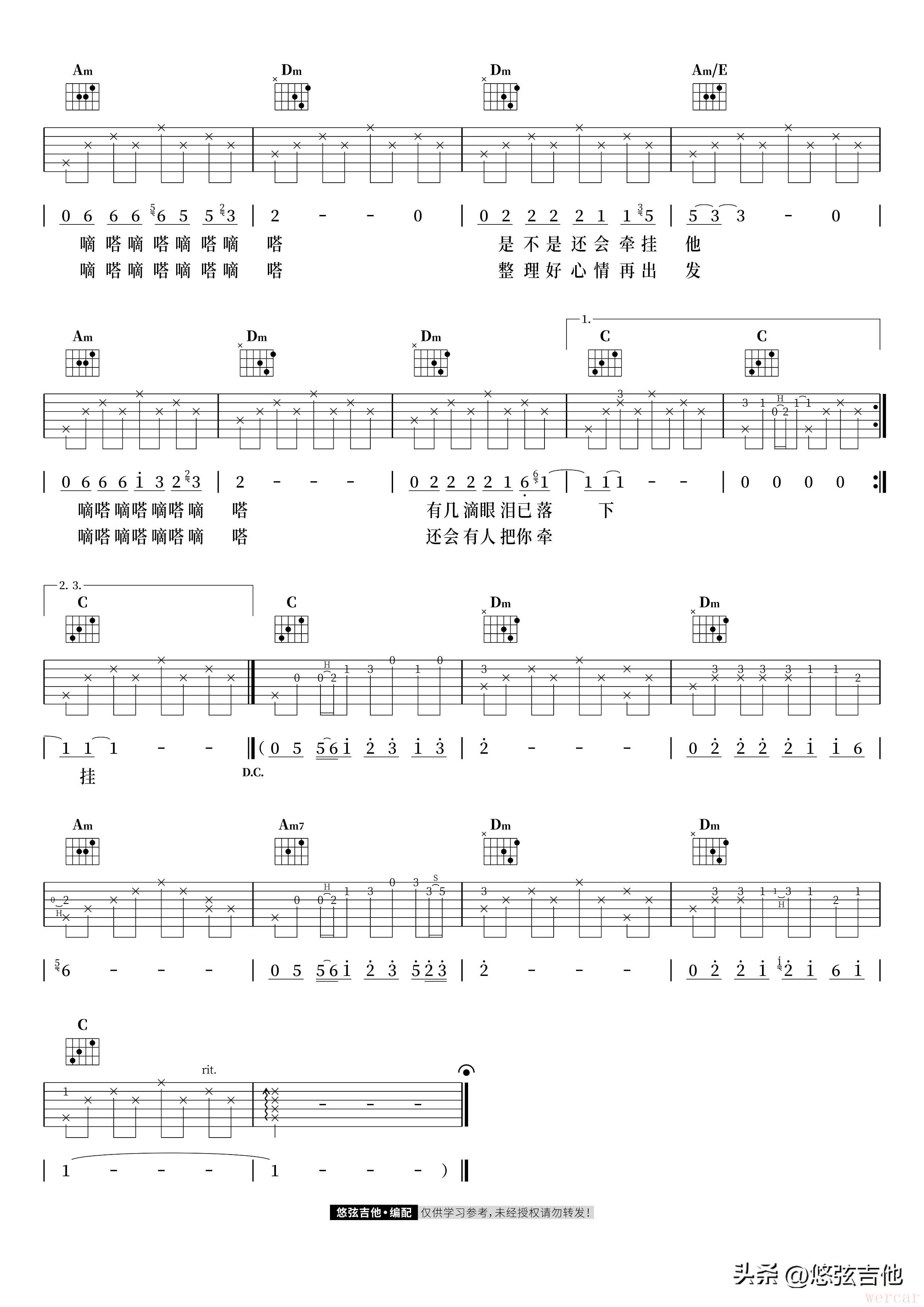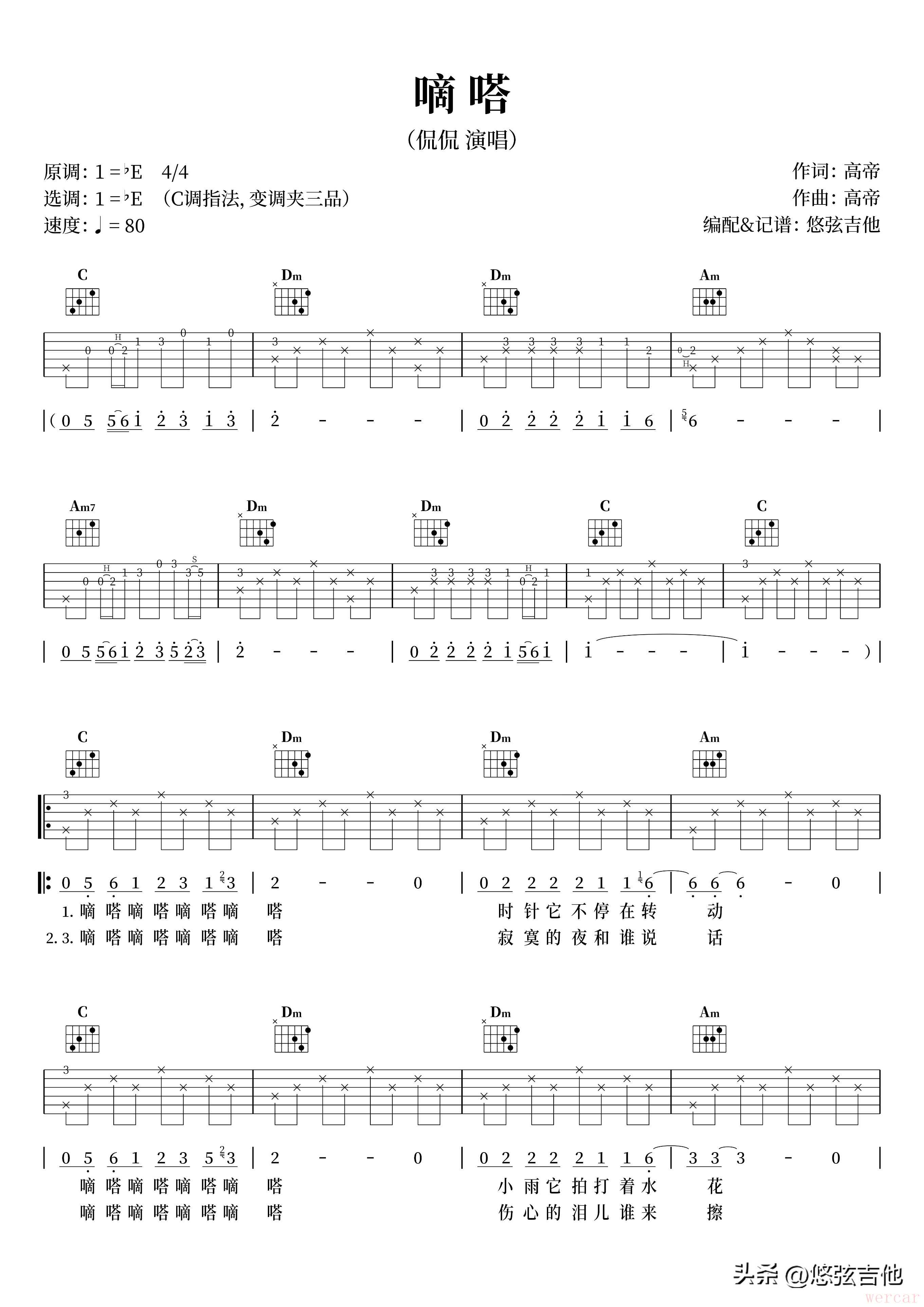 没问题!《嘀嗒》是由许巍演唱的经典歌曲,旋律优美,传唱度很高。下面为您提供一份比较简洁、适合初学者或自弹自唱的吉他弹唱曲谱(C调)。