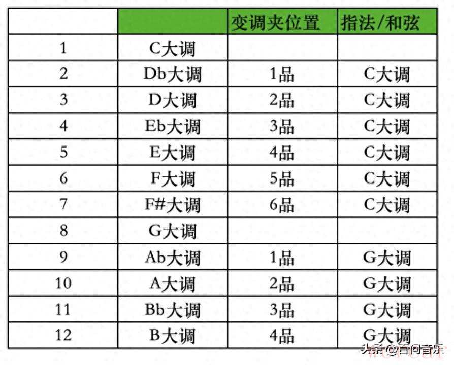 很多吉他初学者应该都会听老师讲过,初学阶段学习C大调和G大调就可以弹奏12个大调音阶了。具体是怎样实现的呢?这就要说到我们今天的主题-变调夹了。先说结论,变调夹夹2品,用C大调音阶和和弦,就可以弹奏D大调的歌曲,变调夹位置汇总如下: