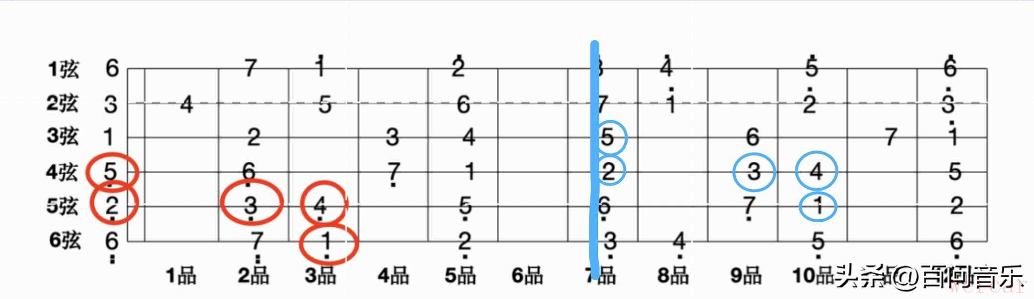 还是以G大调为例,如果把变调夹夹在七品,将变调夹位置(七品)当作空弦音,用C调的mi指型,就可以实现G调的欢乐颂了。下图红色圆圈的音,是不用变调夹,用G调指法弹奏欢乐颂所需要的音;蓝色圆圈的音,是夹变调夹后,用C调指法弹奏欢乐颂所需要的音,其在吉他指板的位置,是不是和C大调一样呢(变调夹位置视为空弦音)?