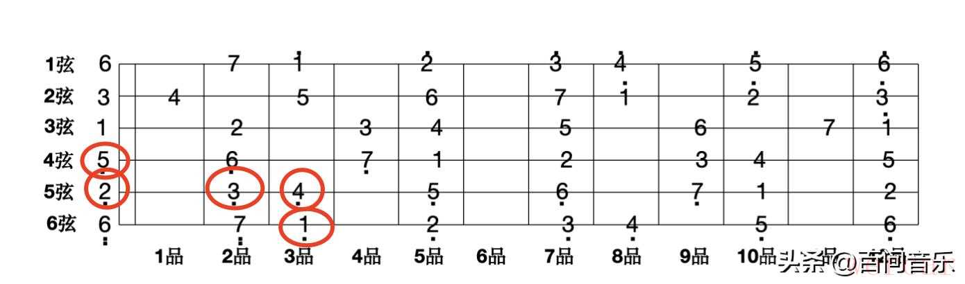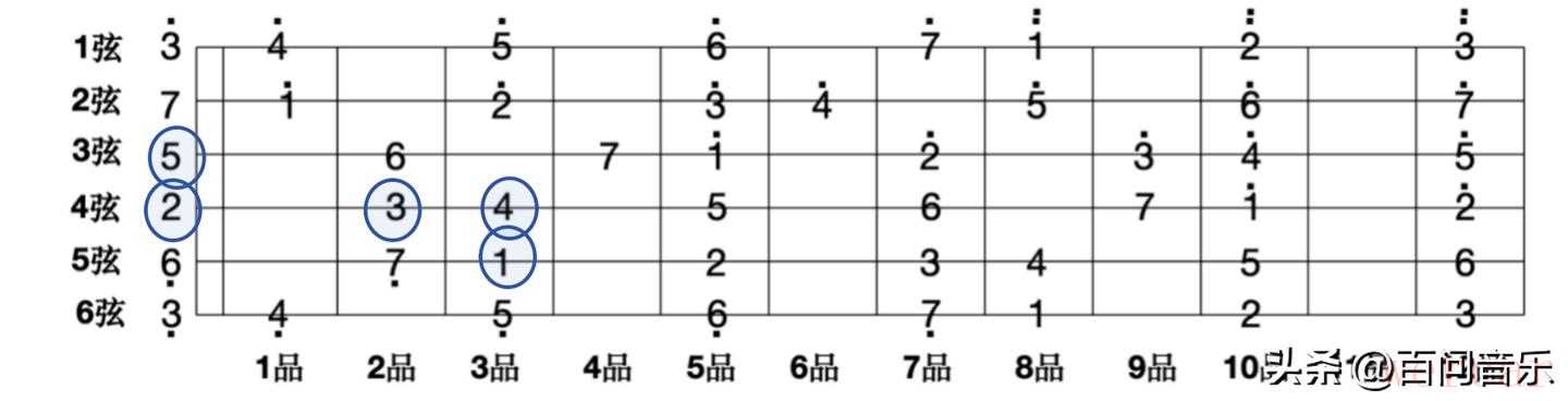 我们以C大调和G大调为例,分别弹奏欢乐颂调的前四小节3345 5432 1123 322-,包含的音为1,2,3,4,5,在C调中可以用mi指型在前三品弹奏。