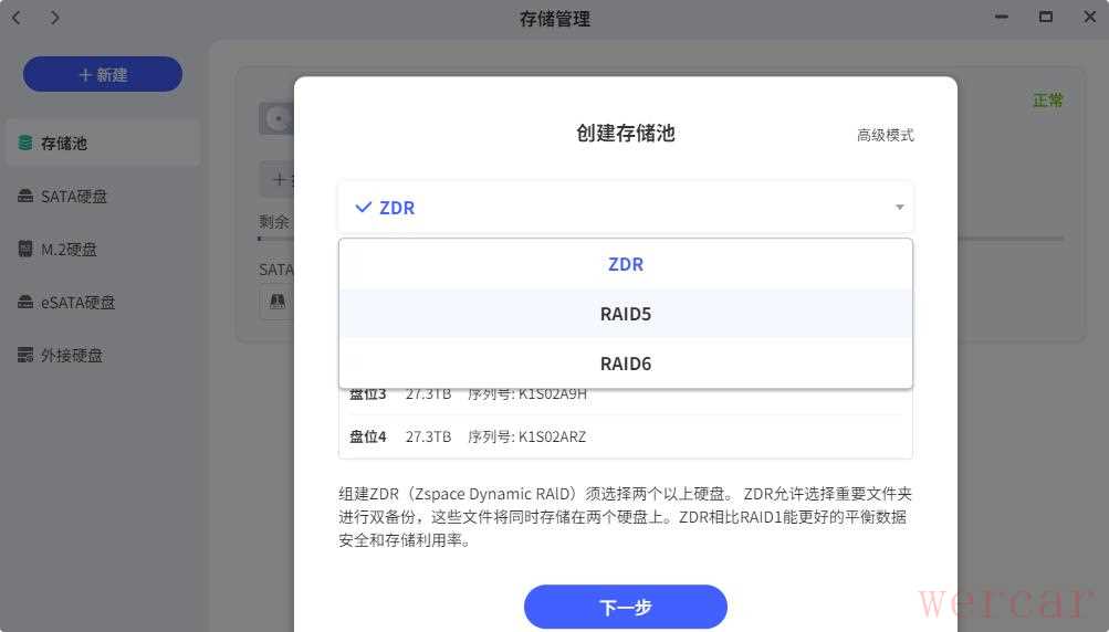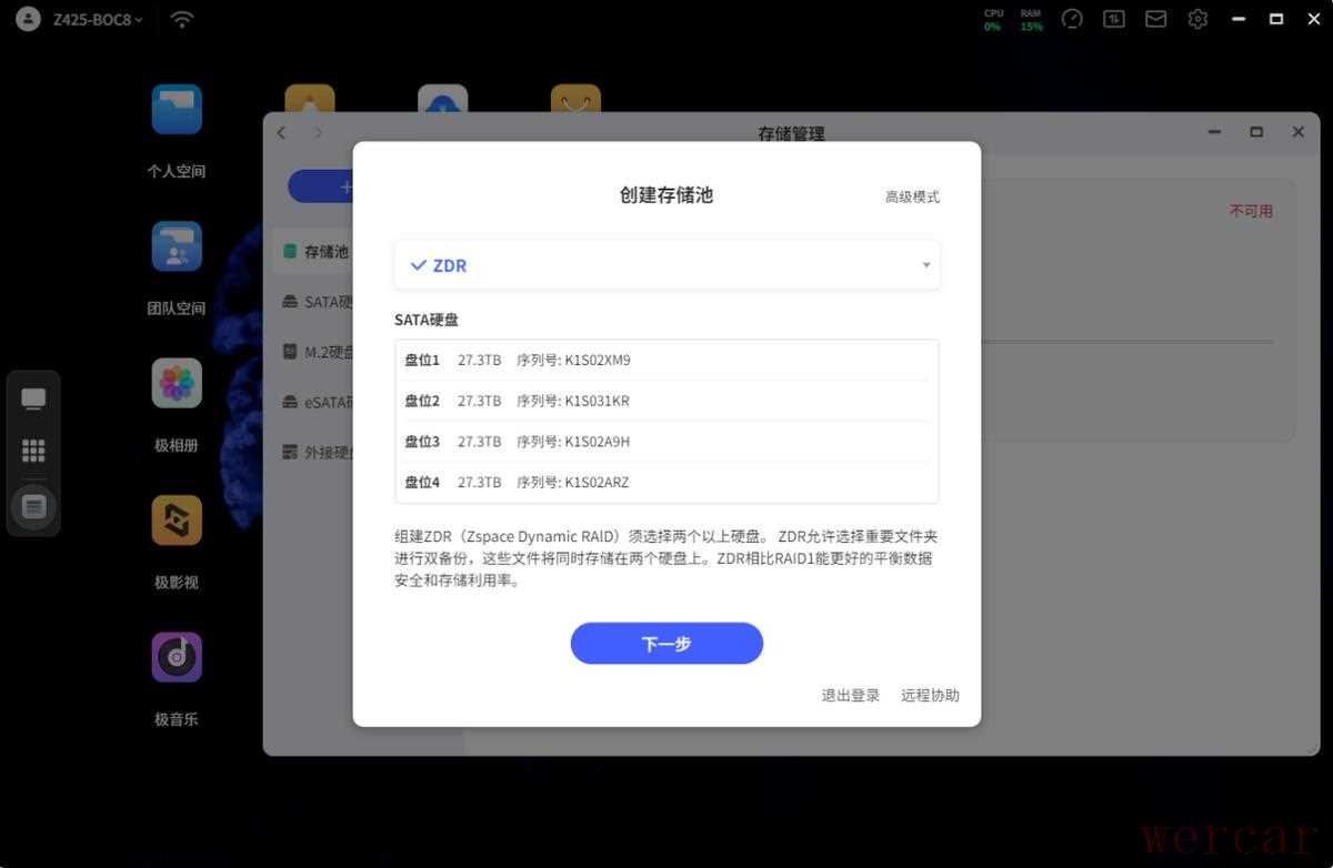 Z425在4个SATA硬盘插满的情况下,支持ZDR、RAID5和RAID6三种存储池创建模式,要想实现最大存储容量,就选择ZDR模式。