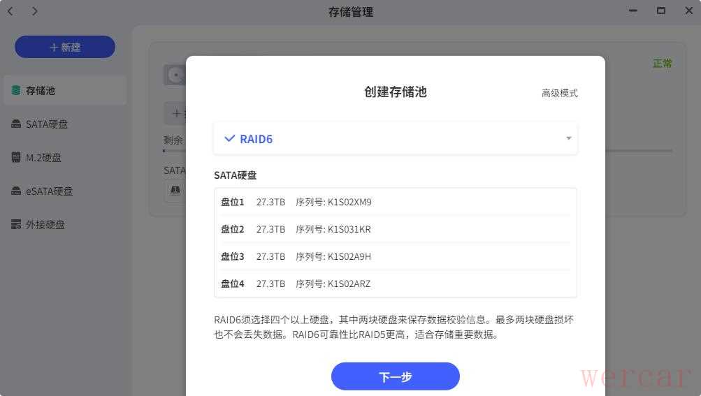 有人说,一下子给我109.1TB的数据仓库,虽说是CMR传统磁记录,稳定性高,还是觉得这样用着很危险,万一其中一个硬盘挂掉,这NAS无法运转了数据就可能出现问题。事实上,很多人可能都不会很快攒够这么多素材,那不妨选择组建RAID备份模式。