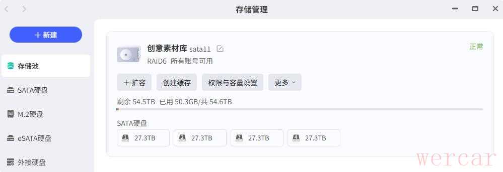 RAID6模式下,存储池可用容量为54.6TB,这也能满足大多数情况下数据存储使用了。