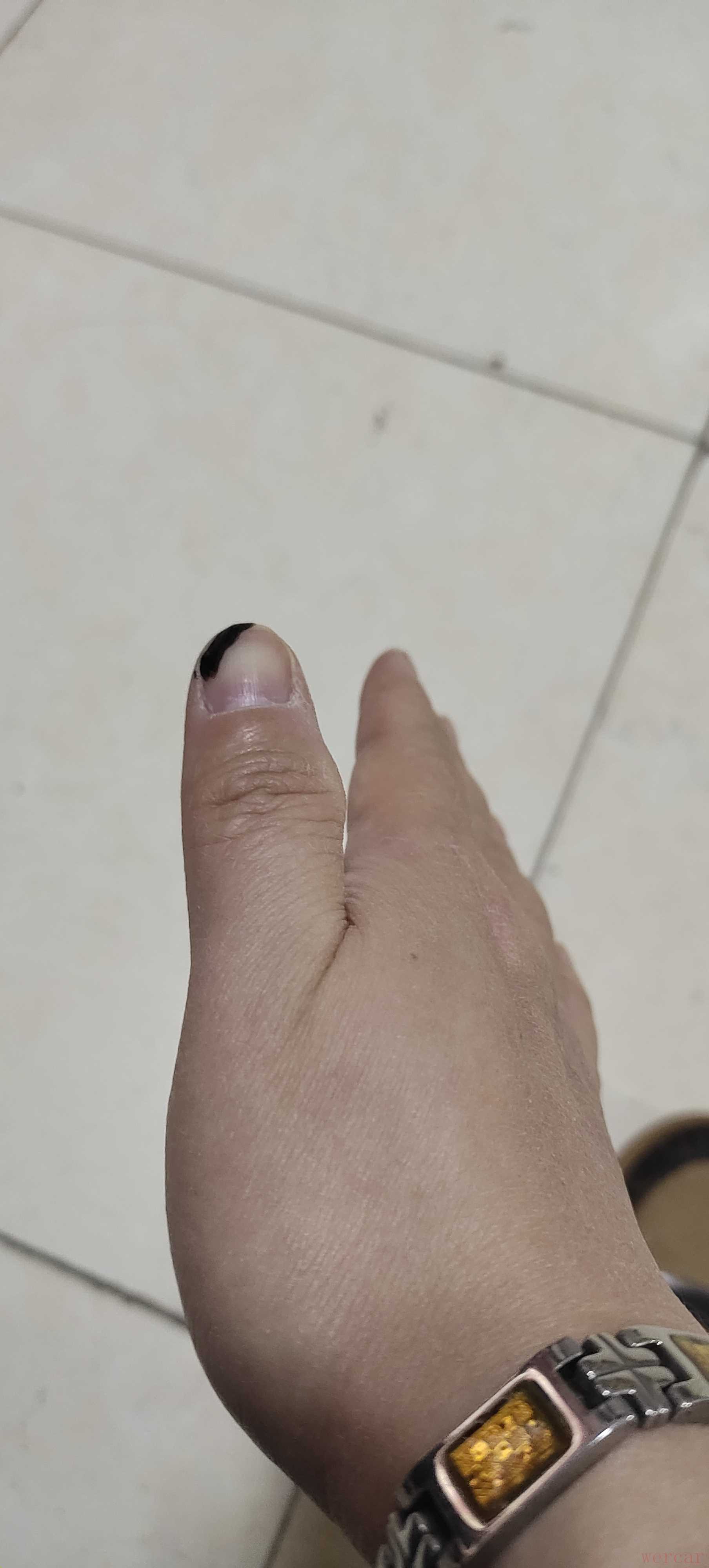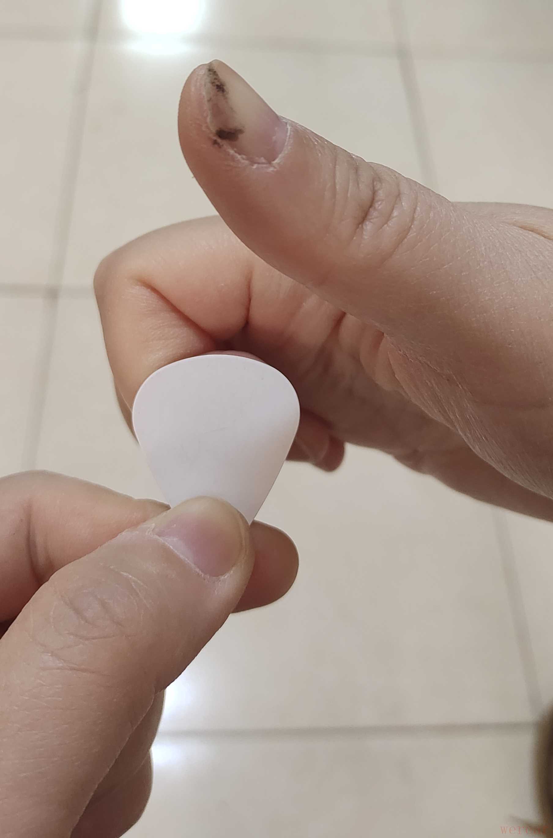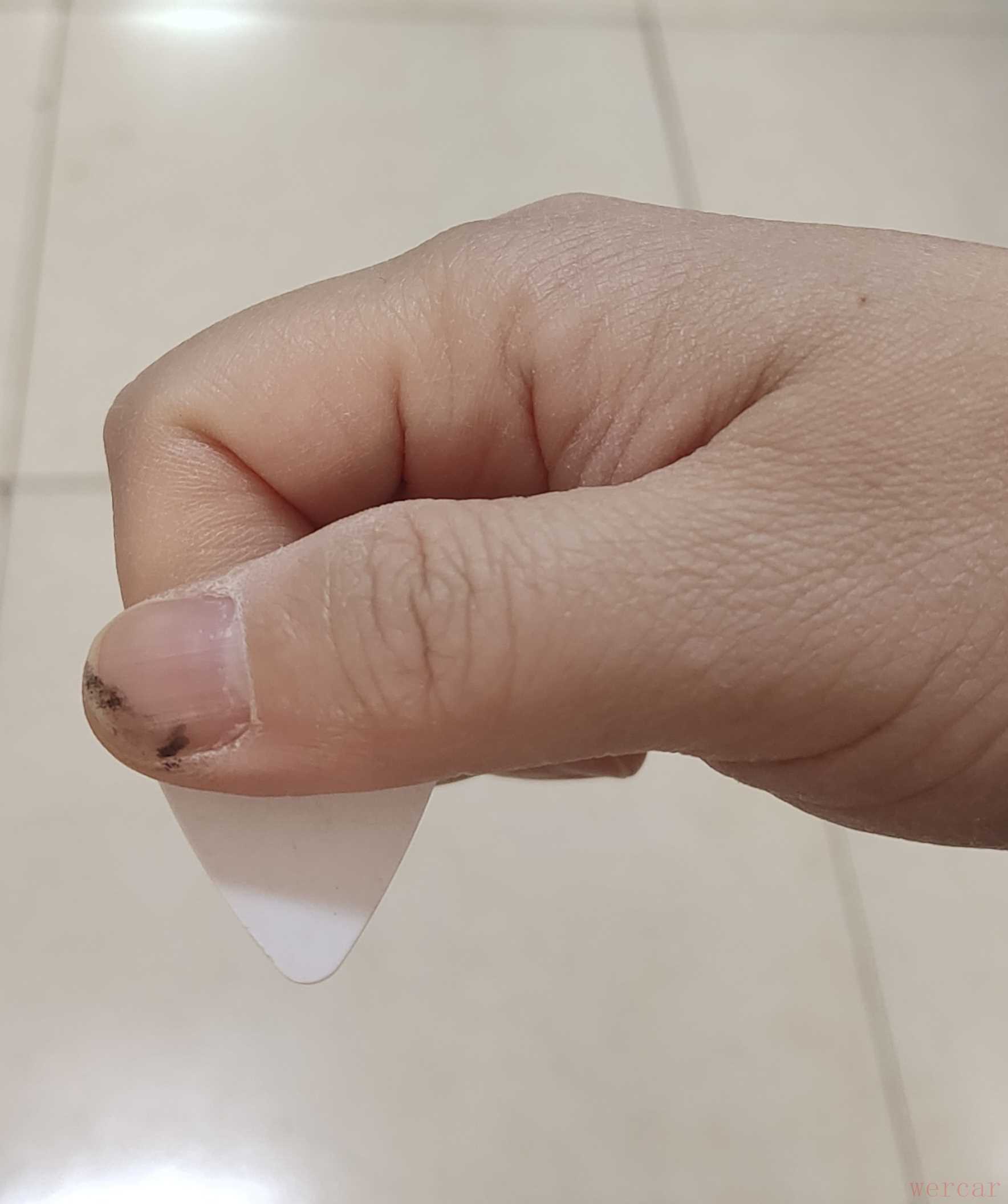先找左手帮忙,将拨片上方宽的二分之一处贴在右手食指指尖侧面、指尖第一关节处,并将食指指尖向里收。看下图: