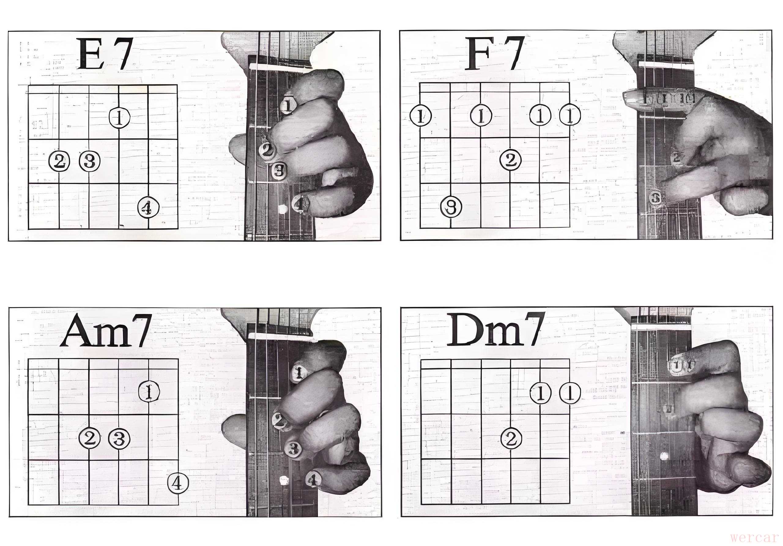 "七和弦 (7th Chords):" 大七 (maj7)、属七 (#7)、小七 (m7)、半减七 (m7b5)、全减七 (dim7)。属七和弦是摇滚、爵士的标志性声音。