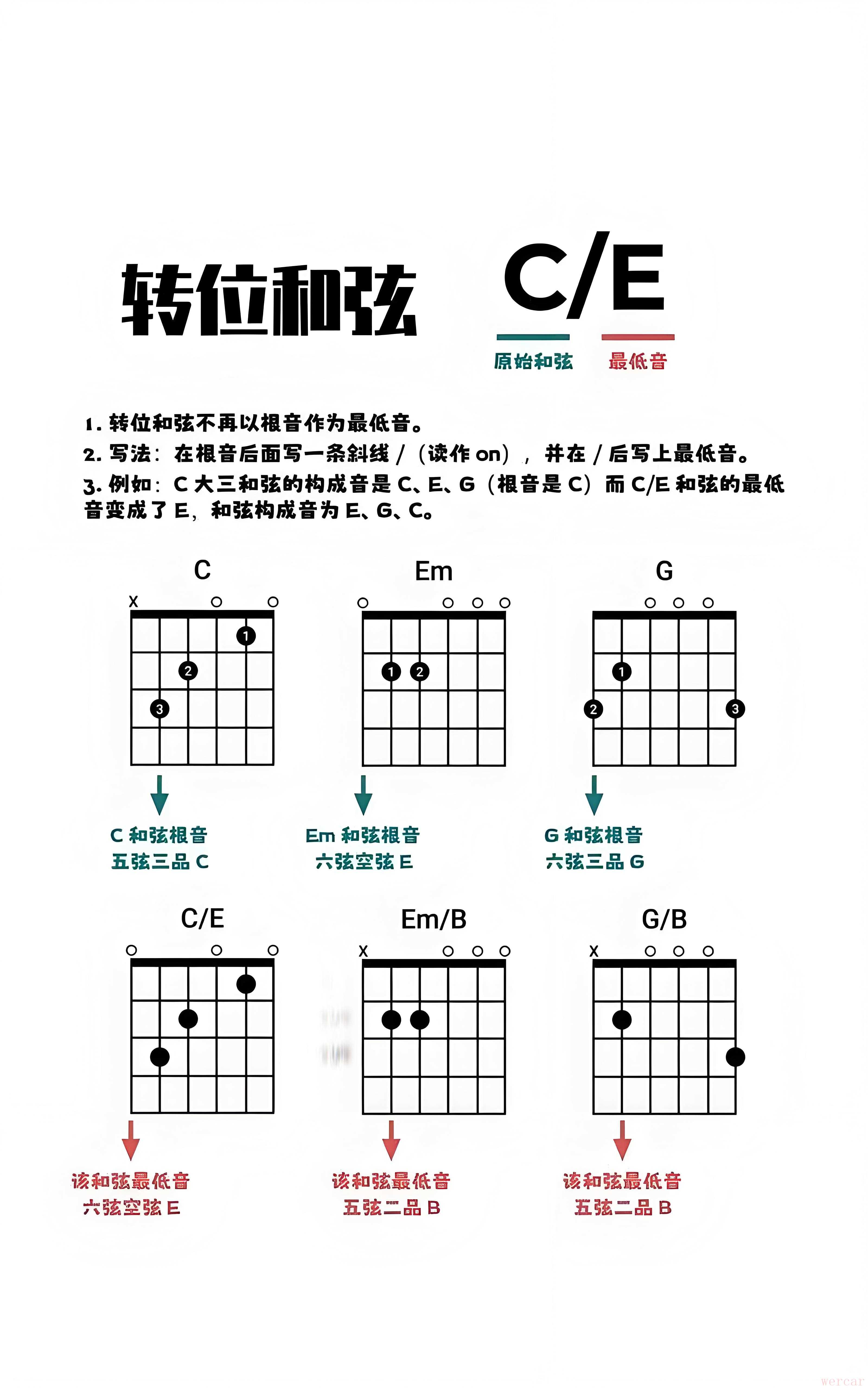 • 转位时高音弦旋律音不动(如C转C/E时保留1弦E)