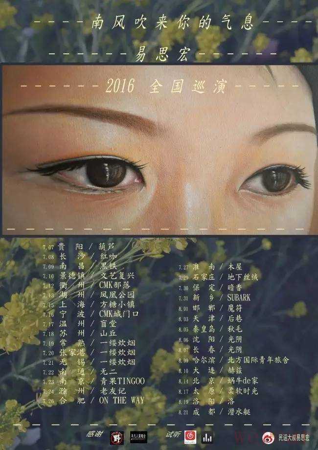 易思宏”南风吹来你的气息”全国巡演,易思宏,来自四川,民谣音乐人,美术老师,油画匠。他的作品从传说中的《北冥有鱼》到家乡的《阿姐阿妹》,虽然少了些姑娘、远方、流浪、忧伤,却可以用时而婉转的轻吟,时而放声的感叹,讲述着现实或遥远故事。