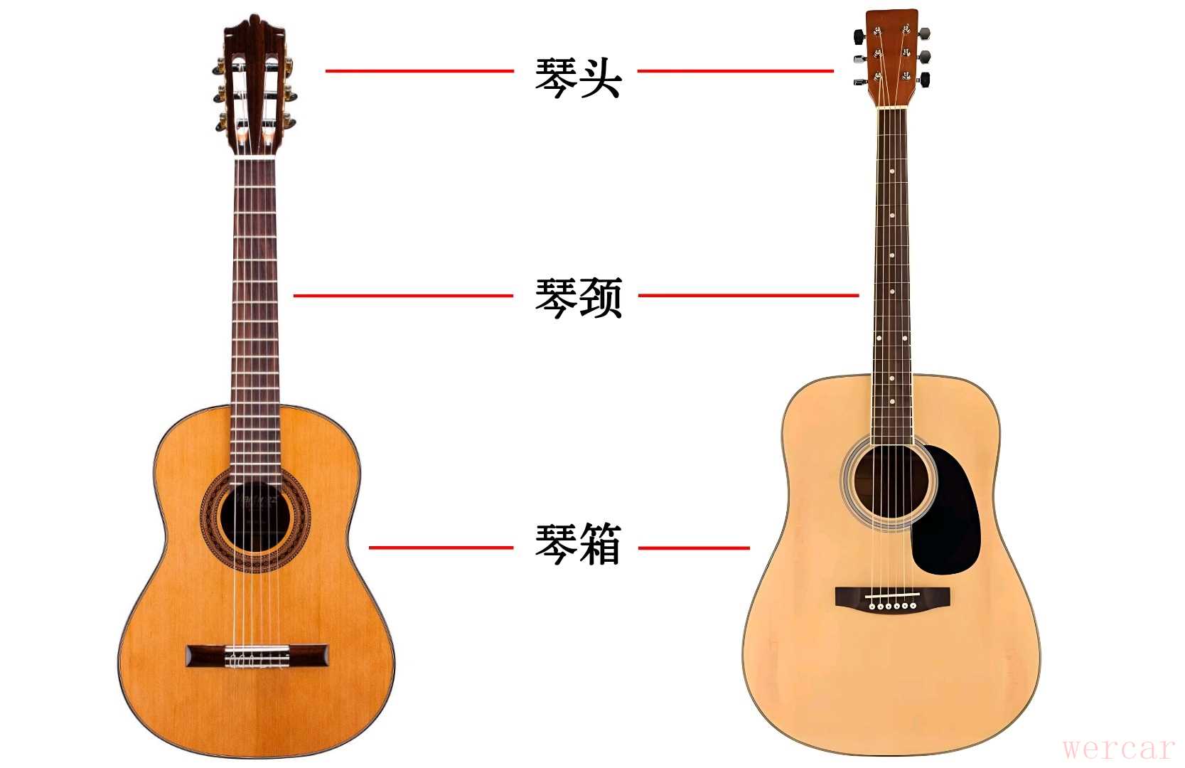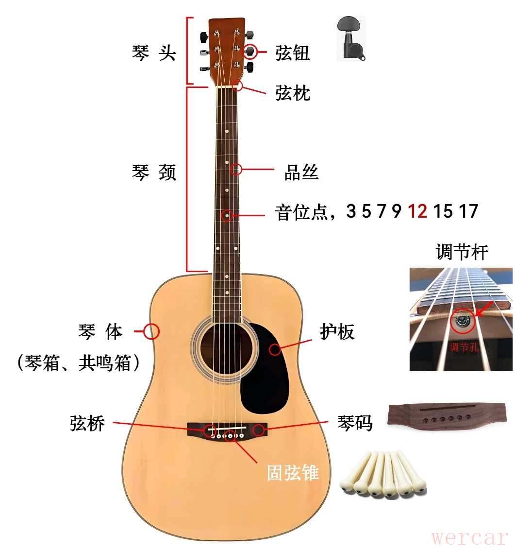 无论你是打算学古典吉他、民谣吉他还是电吉他,基本的构造是相似的。我们先以最常见、最适合自学的"民谣吉他(Acoustic Guitar)"为例来认识。