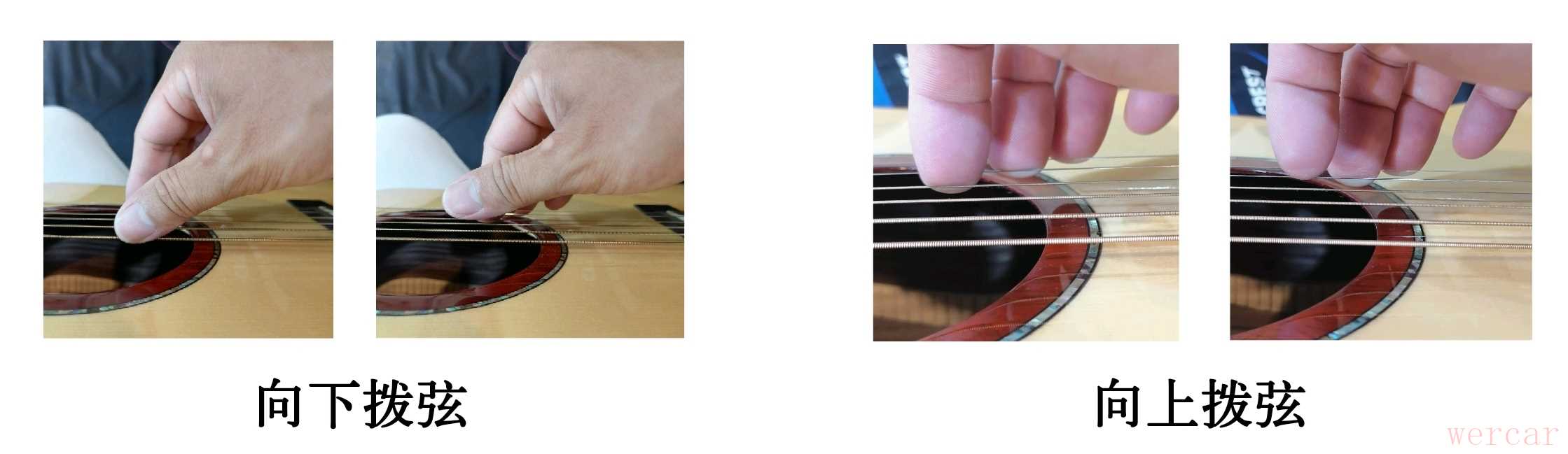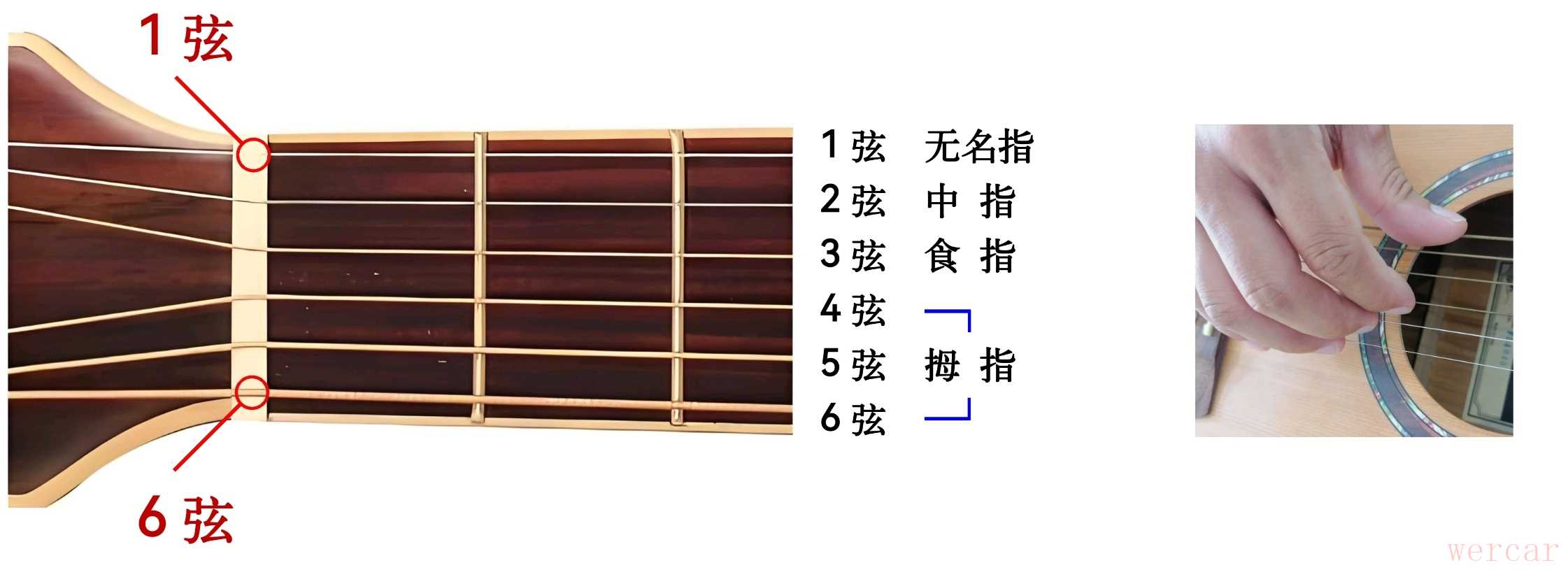2,吉他上最细的是1弦,最粗的是6弦,为了更方便地弹奏,拇指一般下拨654弹。。食指上勾3弦,中指上勾2弦,无名指上勾1弦。