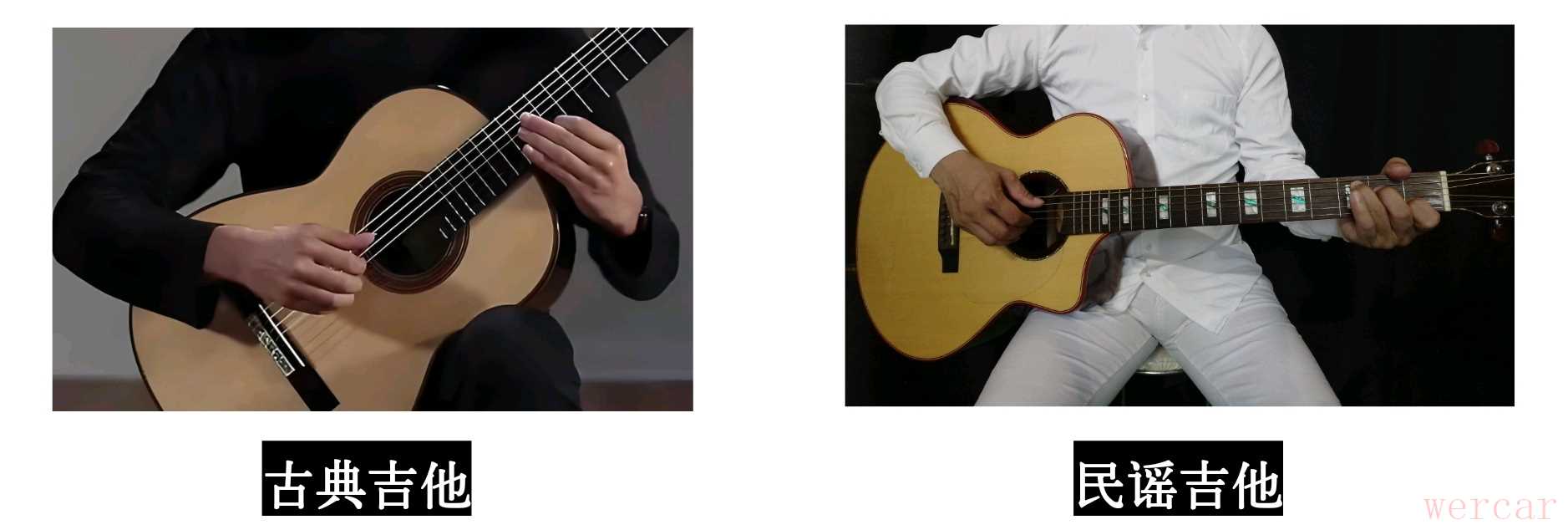 1,古典吉他 : 琴头一般为镂空,弦钮采用塑料或实木。琴颈宽而短,琴体(琴箱)较小,琴弦一般采用尼龙弦。多为垫脚式弹奏。
