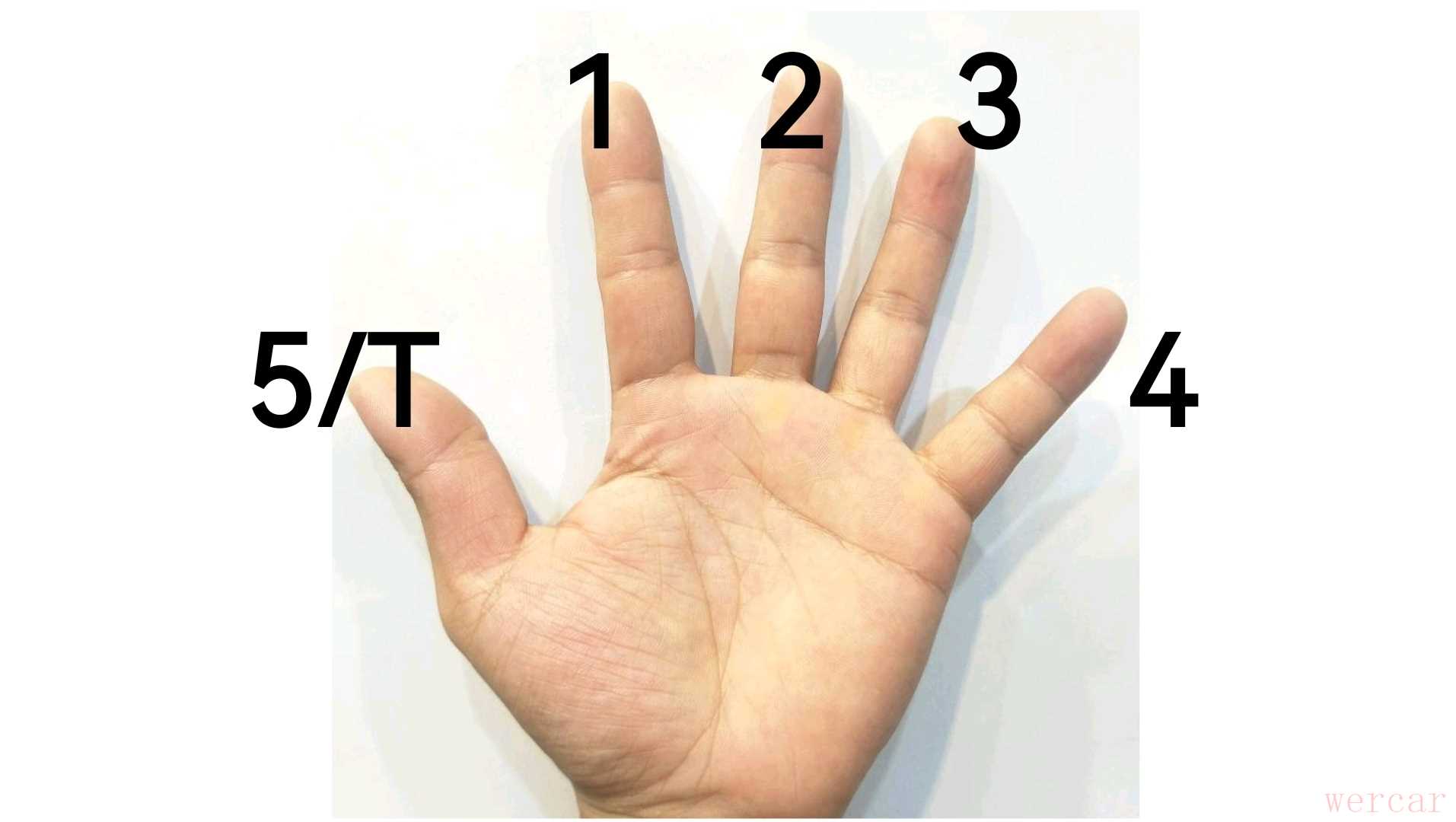 1,左手的食指、中指、无名指、小指、拇指,用12345(T)来表示。拇指5(T)较为少用。