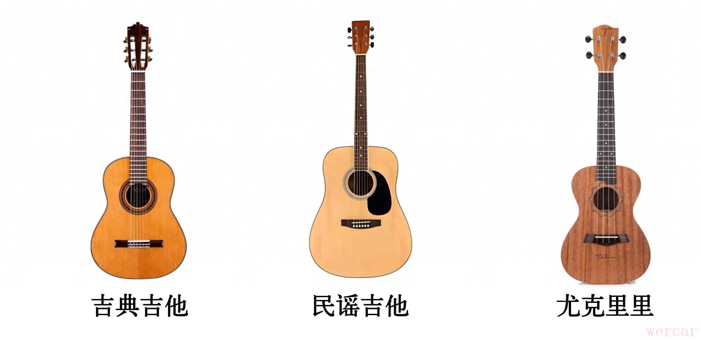 1,原声吉他 : 有琴箱有音孔,通过琴箱共震产生音色的吉他。如古典吉他,民谣吉他,尤克里里,弗拉门戈。