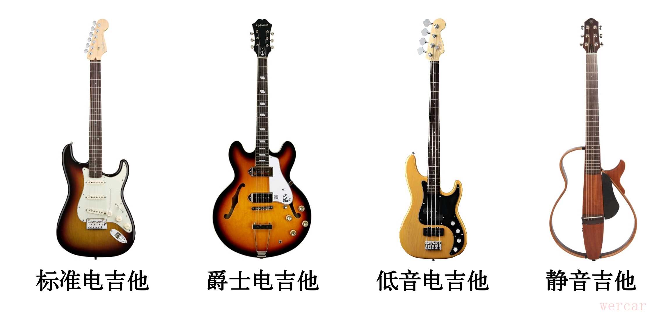 "电吉他 (Electric Guitar):" 需要连接音箱才能发出声音,琴体较薄,通常有磁拾音器。适合摇滚、布鲁斯等风格,技巧表现力非常丰富。