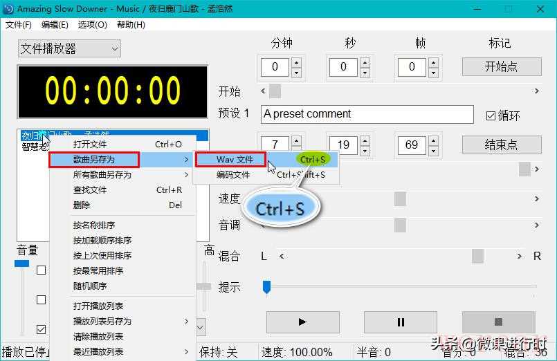 最后是声音的输出,在列表中点右键,选择“歌曲另存为”——“wav文件”: