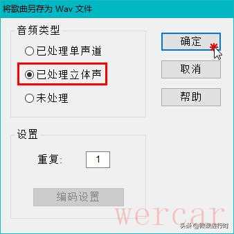 在弹出的对话框中,选择“已处理立体声”,点击“确定”按钮。这样处理后的声音就输出了!