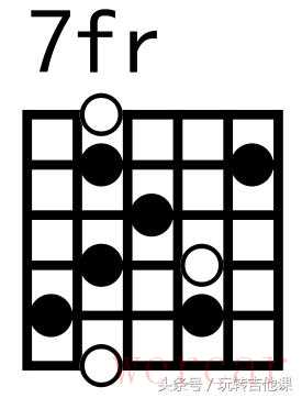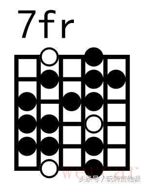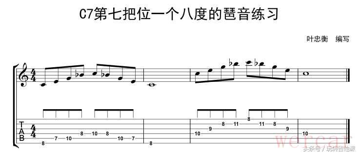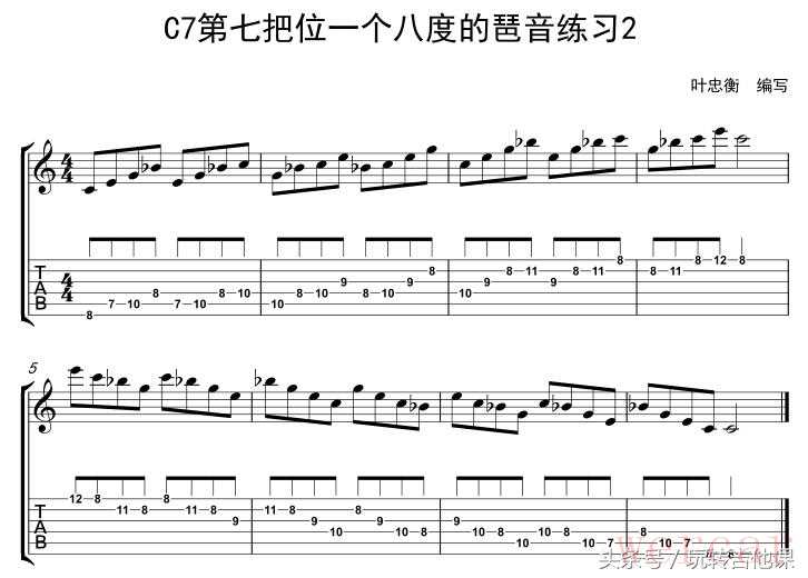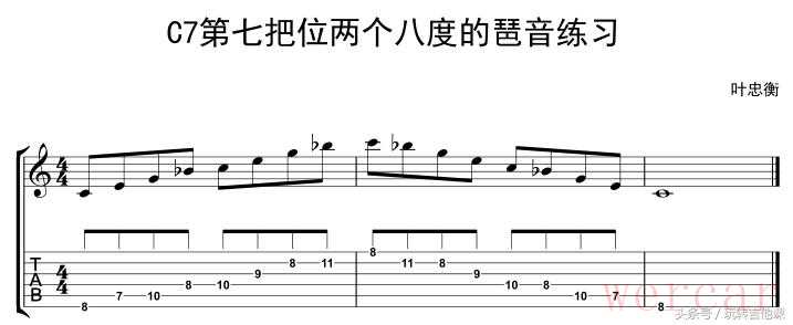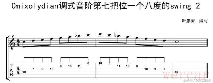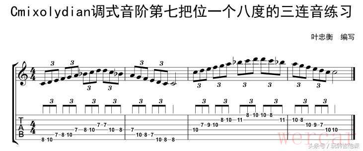 好了,来今天的正式练习内容了,今天要说的是Cmixolydian调式音阶第七把位完整基本功练习,先来看看指法图: