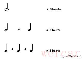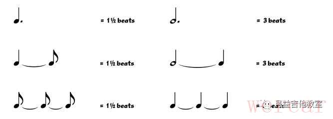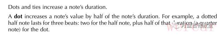 附点和延音增加了音符的时值。 一个附点延长了原来这个音符的一般的时值。比如,一个二分附点音符持续三拍:二分音符两拍,加上附点的一拍(二分音符两拍的一半,即四分音符)。