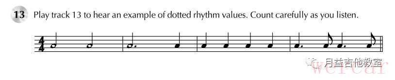 演奏音频13会听到附点节奏的范例。听的时候仔细数拍子。附点和延音音频:00:0000:23