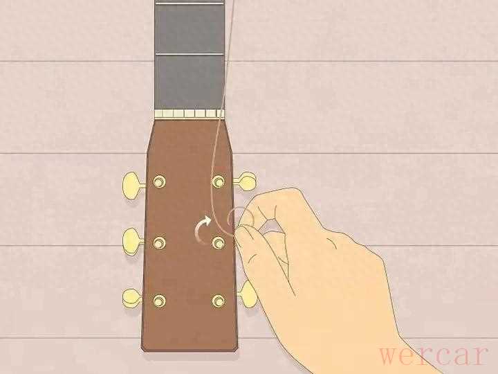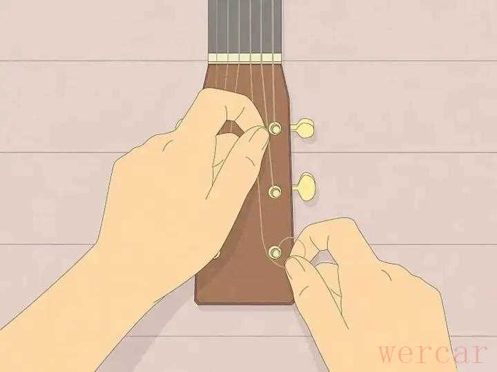 4、一旦胶水干透,就可以使用旧弦或新弦重新为吉他装弦了。将弦的下端放回桥位,用弦钉固定,然后将上端绕在调音柱上。使用调音柱调整弦的张力,并将弦调至正确的音高。 在重新装弦之前,使用石墨铅笔涂抹在琴枕的弦槽上。这样可以使弦槽更易于辨认,帮助你将弦准确地引导到正确的位置。