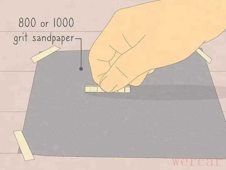 2、使用800或1000目的砂纸打磨新吉他琴枕,直到它合适为止。在平坦的工作面上放一张细砂纸,并用遮蔽胶带固定。一点一点地打磨琴枕的底部和侧面,一边打磨一边通过将其放置在吉他上测试其形状。当新琴枕与旧琴枕高度相同时,以及其边缘不再从吉他颈部突出时,停止打磨。