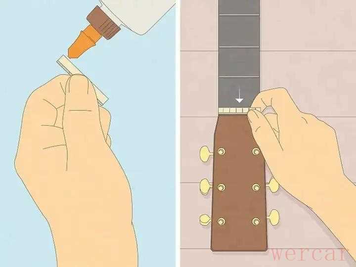 · 用木工胶固定新的琴枕,让其干燥24小时。然后重新装上你的吉他弦。