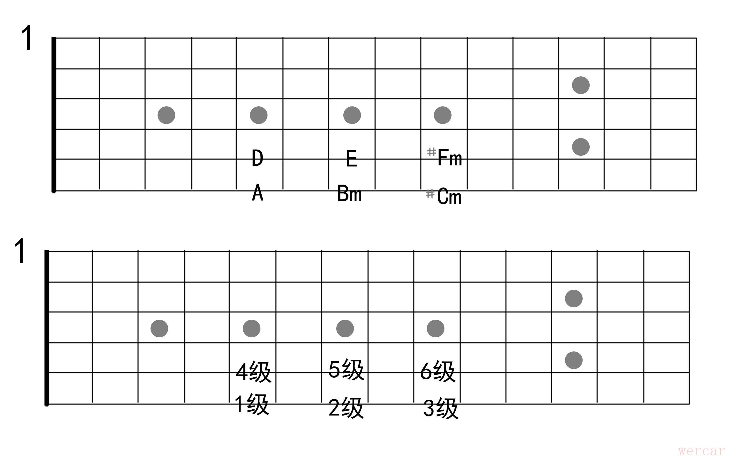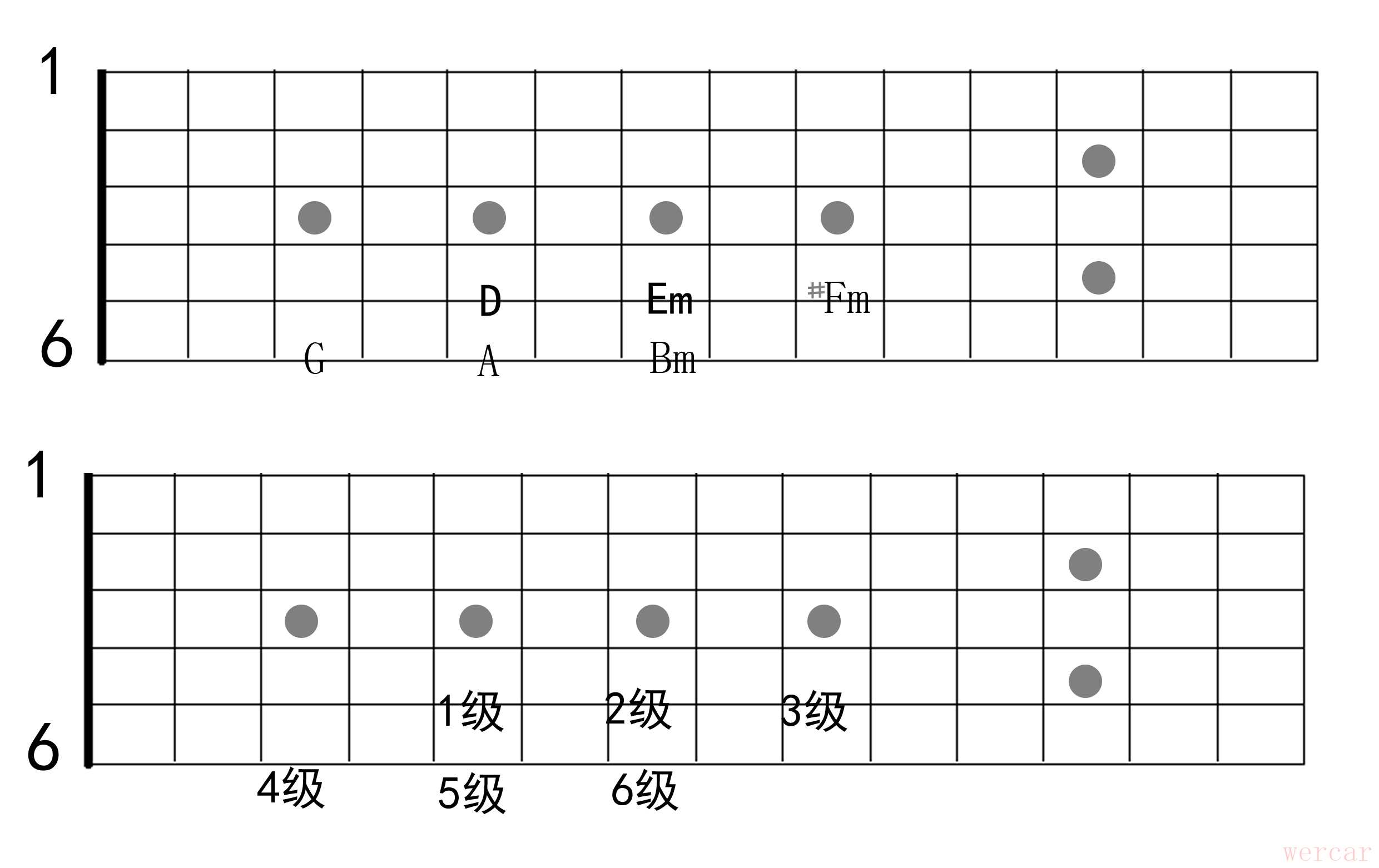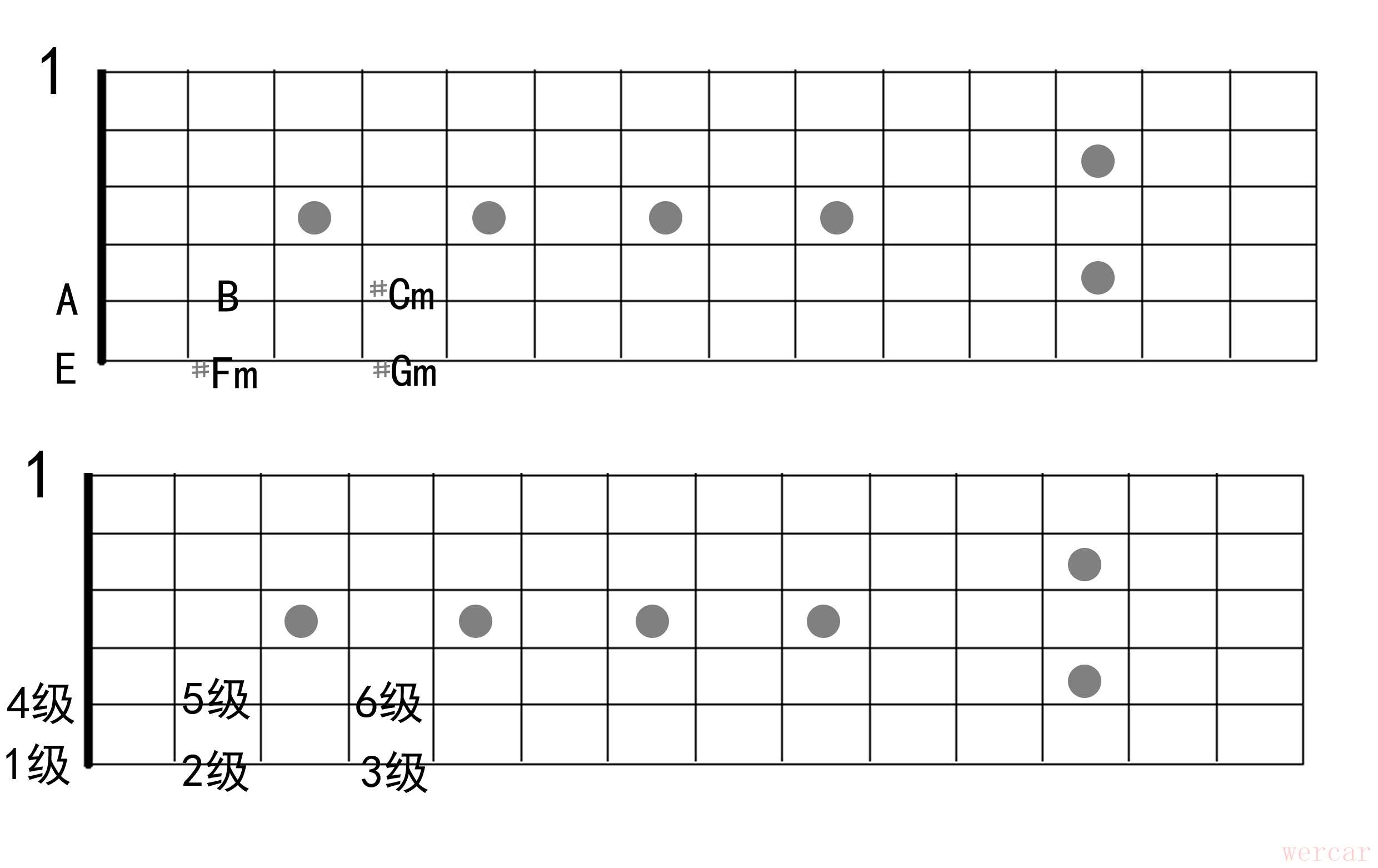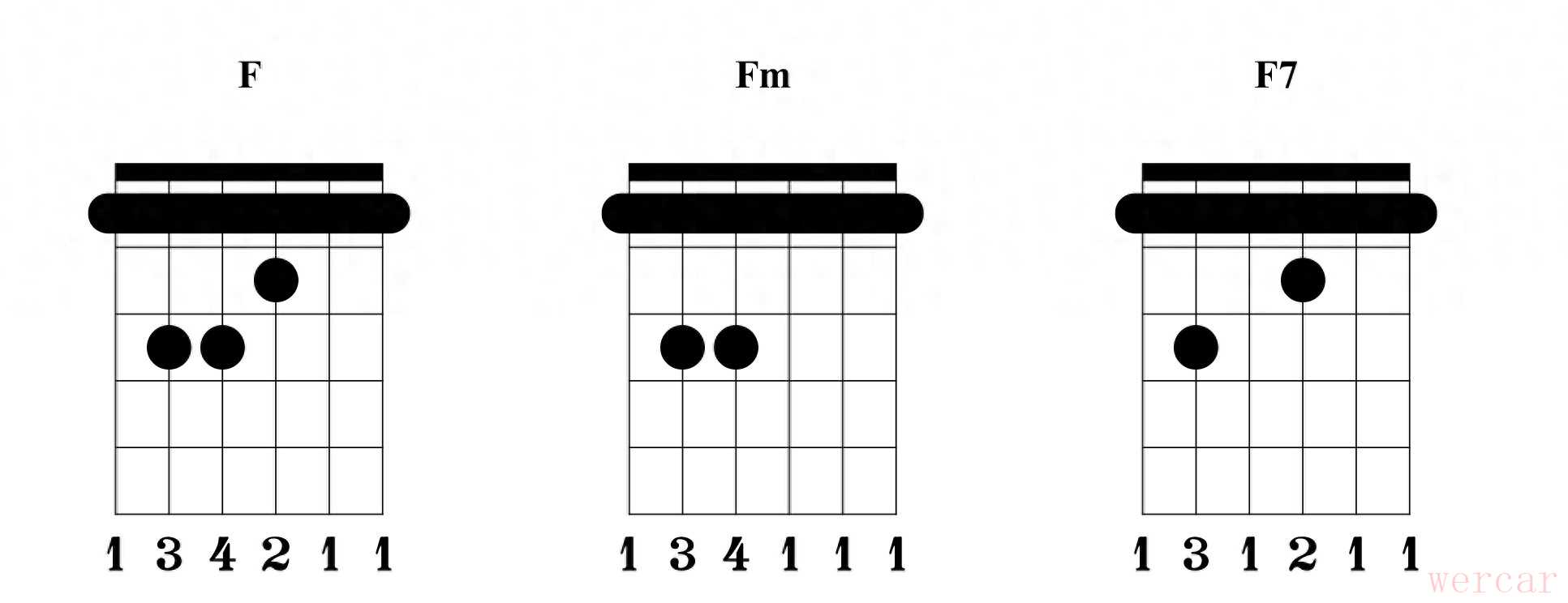 (2)指法分析:F大调的一二三级和弦,根音都建立在六弦上,一级和弦是大三和弦,使用F和弦的指法,二三级和弦是小三和弦,使用Fm的指法。四五六级和弦根音建立在第五弦上,四级五级和弦是大三和弦,使用♭B和弦指法,六级和弦是小三和弦,使用♭Bm和弦指法。