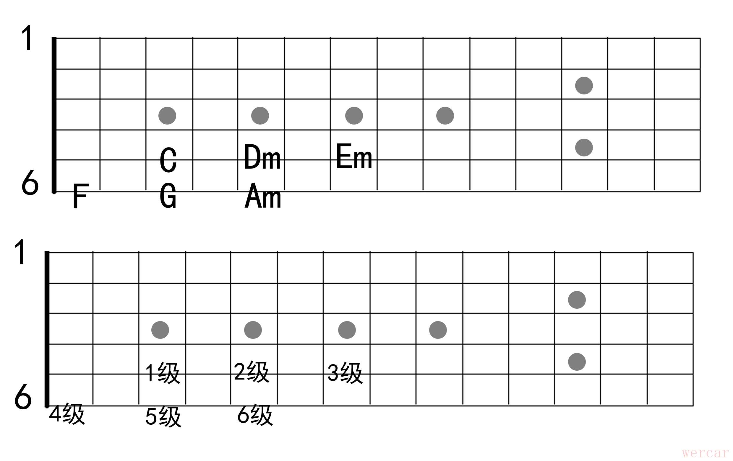 2、七个在调的指法,B调和D调都从C调指法得到,E调G调A调的指法都从F调指法得到,记住C调和F调指法,就记住了所有调的指法。在实际弹唱中,只需要考虑各调中所使用的和弦的级数,不用去考虑每个调中所使用的和弦的名称。