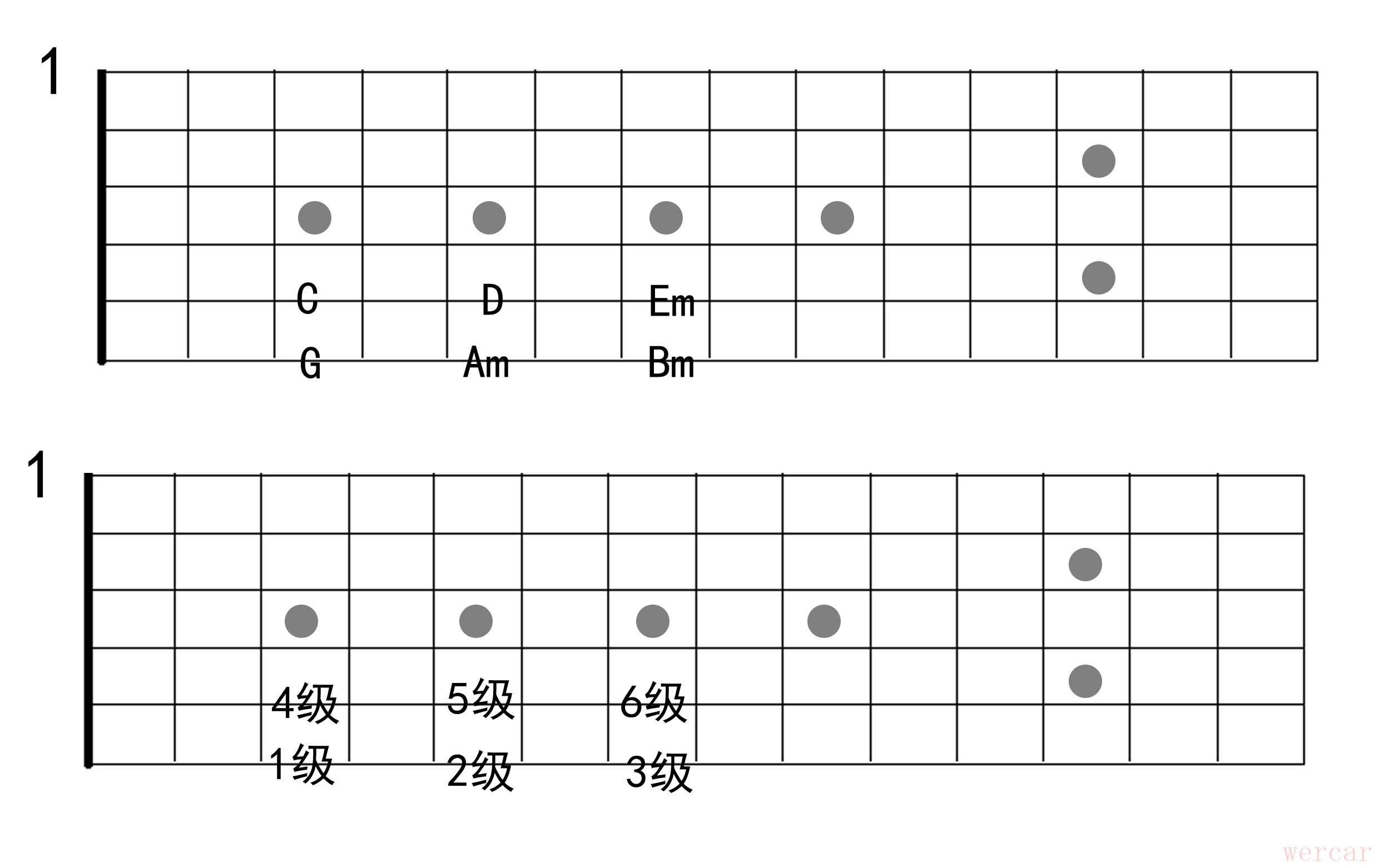 (2)指法分析:C大调的一二三级和弦,根音都建立在五弦上,一级和弦是大三和弦,使用♭B和弦的指法,二三级和弦是小三和弦,使用♭Bm的指法。四五六级和弦根音建立在第六弦上,四级五级和弦是大三和弦,使用F和弦指法,六级和弦是小三和弦,使用Fm和弦指法。