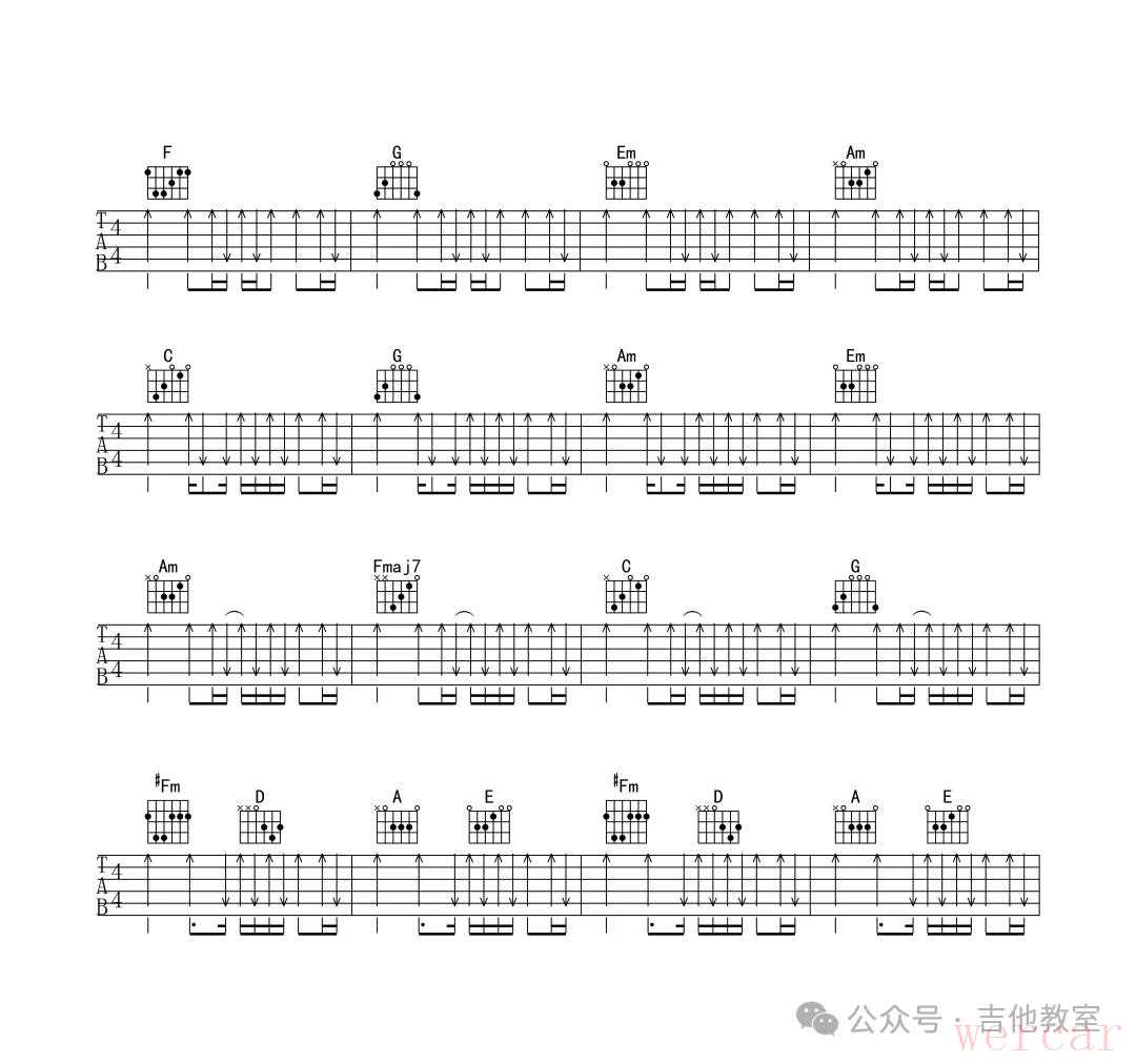 在学习吉他初期中大多数以模仿为主,加上练习常见的扫弦节奏套路来提升自己扫弦的技巧,增强乐感,下面这些常用节奏型都可以适用大部分常见的流行歌曲,在日常中多加练习即可。