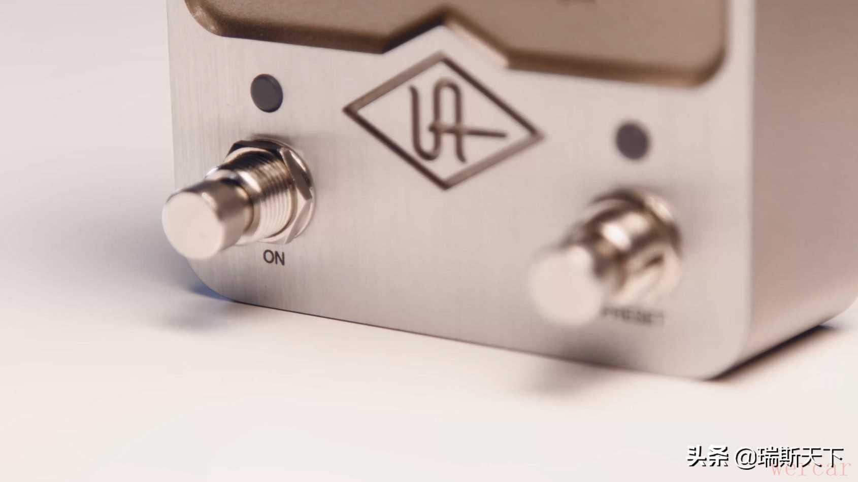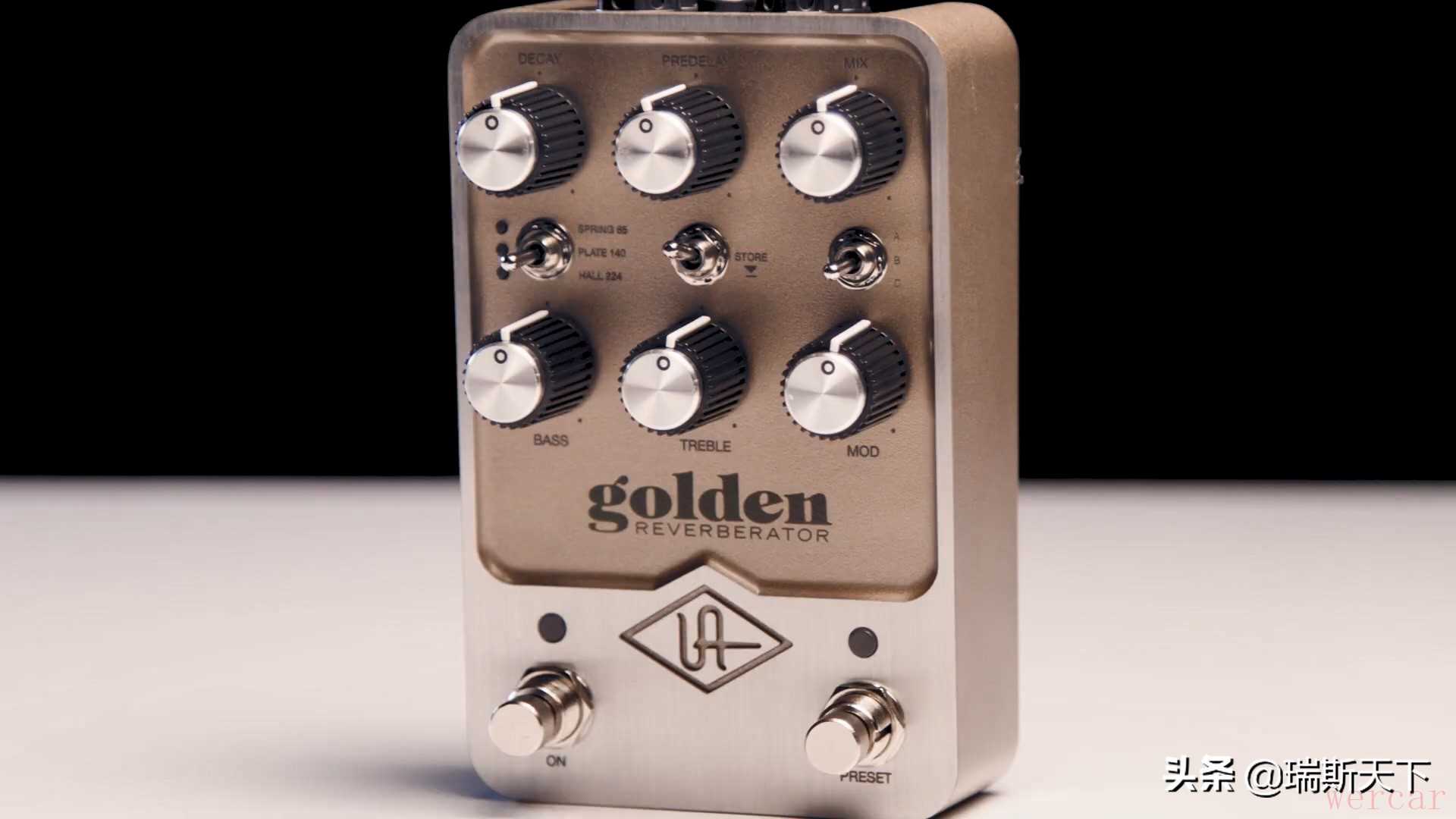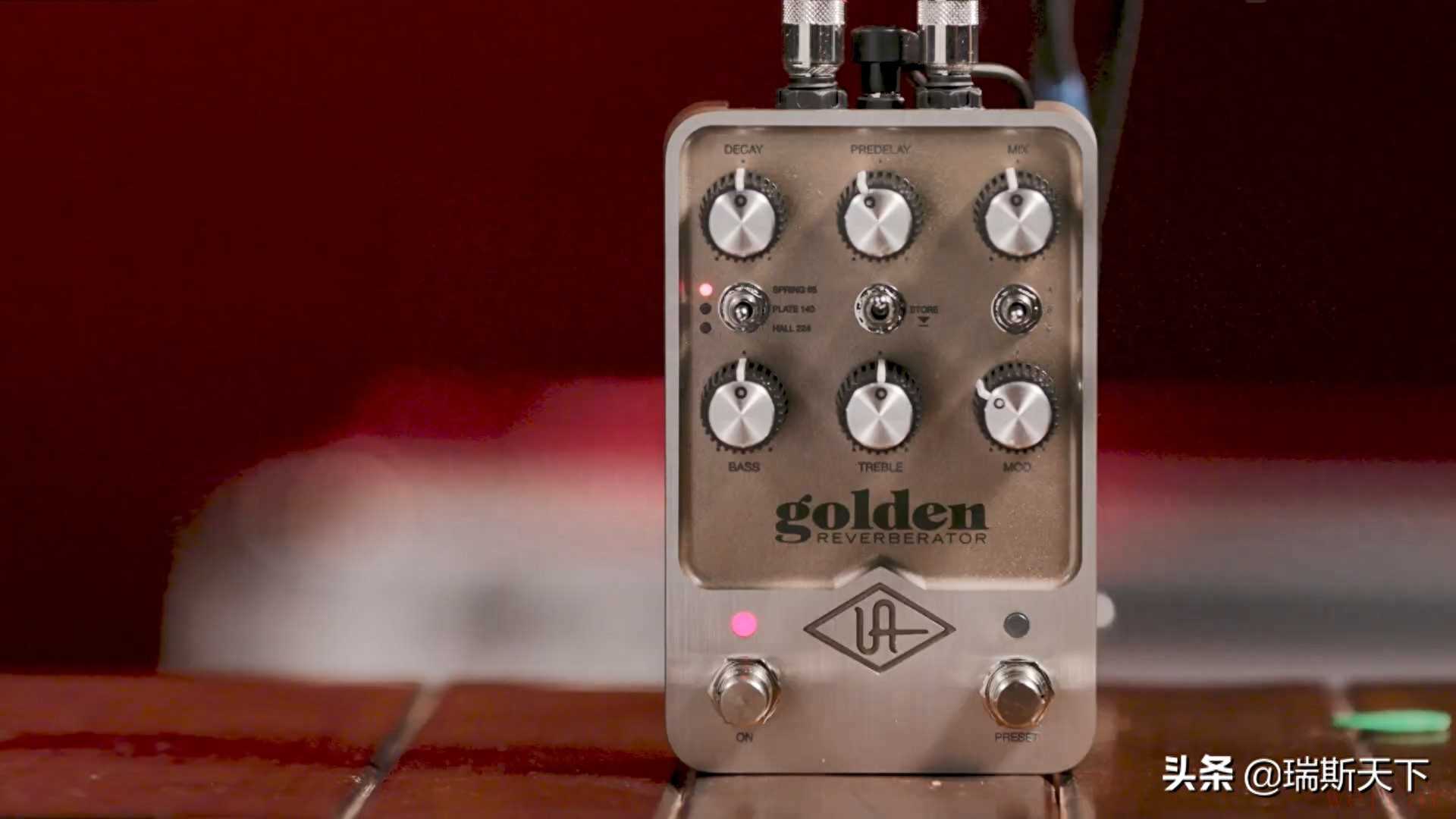 Golden Reverberator这款混响效果器,是Universal Audio最近发布的三剑客其中一员,也是结合了板式混响,以及电子管弹簧混响的混合效果器,同一个系列,自然外观秉承了一贯的设计,大小很接近,比一般的单块大一些,全身金属材质打造坚固耐用,就很适合吉他手,带着它参加演出、移动录音,因为不怕磕碰。