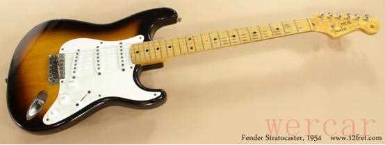 1954年,Fender推出了配备摇杆系统的Stratocaster。它革命性的采用了更加舒适的曲线型轮廓琴体,3个单线圈拾音器,岑木琴体,一块枫木琴颈,硝化纤维油漆双色渐变色,琴头也比Telecaster要更大。这是当时结构最复杂,也是市面上最先进的电吉他款式。因此价格也是比较昂贵的,当时售价约250美金(相当于现在的1850美金)。