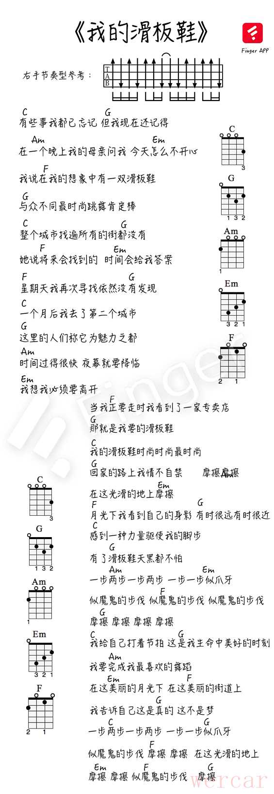 庞麦郎的《我的滑板鞋》是尤克里里弹唱中的热门曲目,旋律简单,节奏明快,非常适合入门学习。下面是一个基础的尤克里里弹唱教学,包含指法和歌词:
