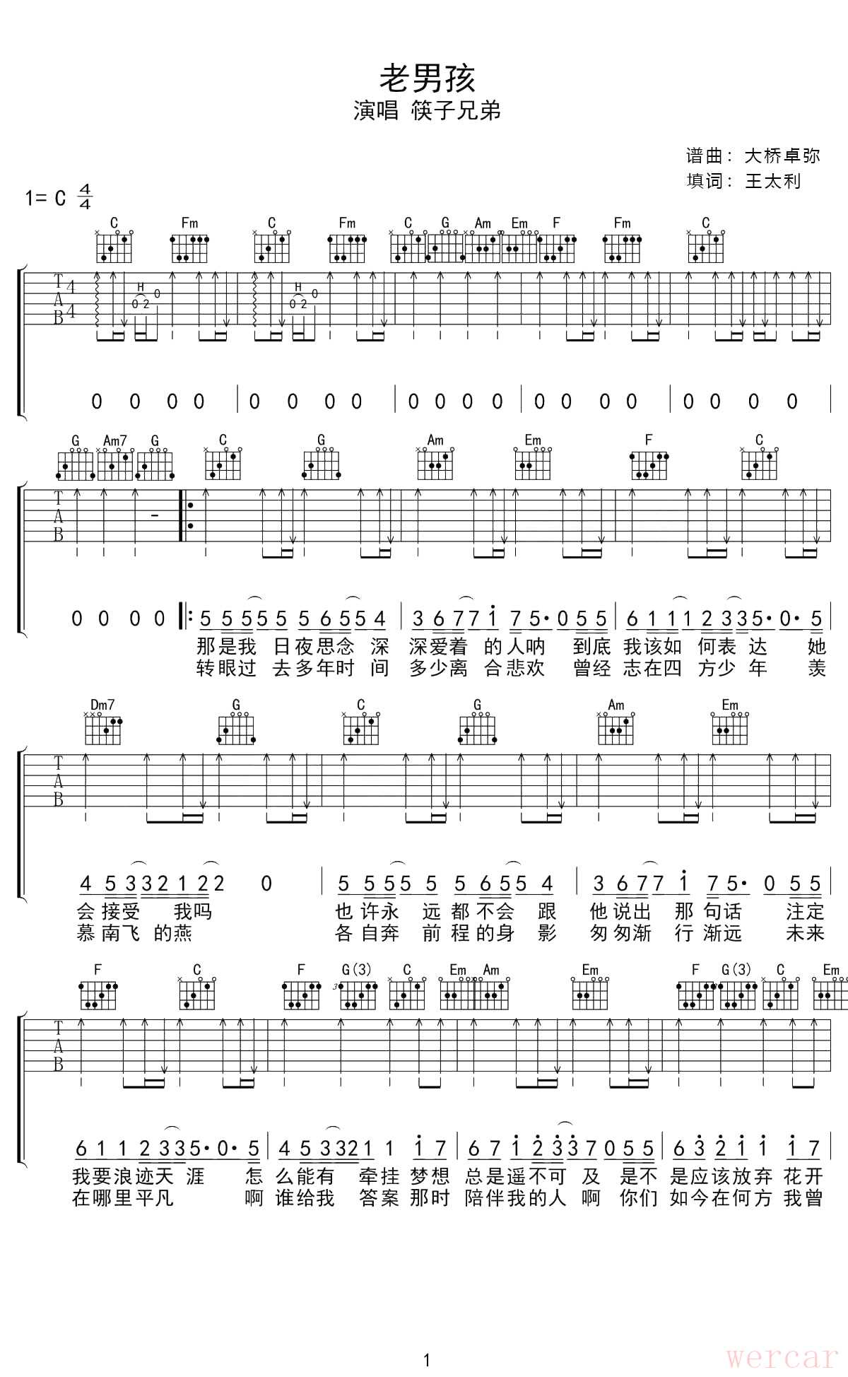 各位热爱音乐和吉他的朋友们,可以对照谱子和音频来演奏。以下是筷子兄弟的《老男孩》音频欣赏: