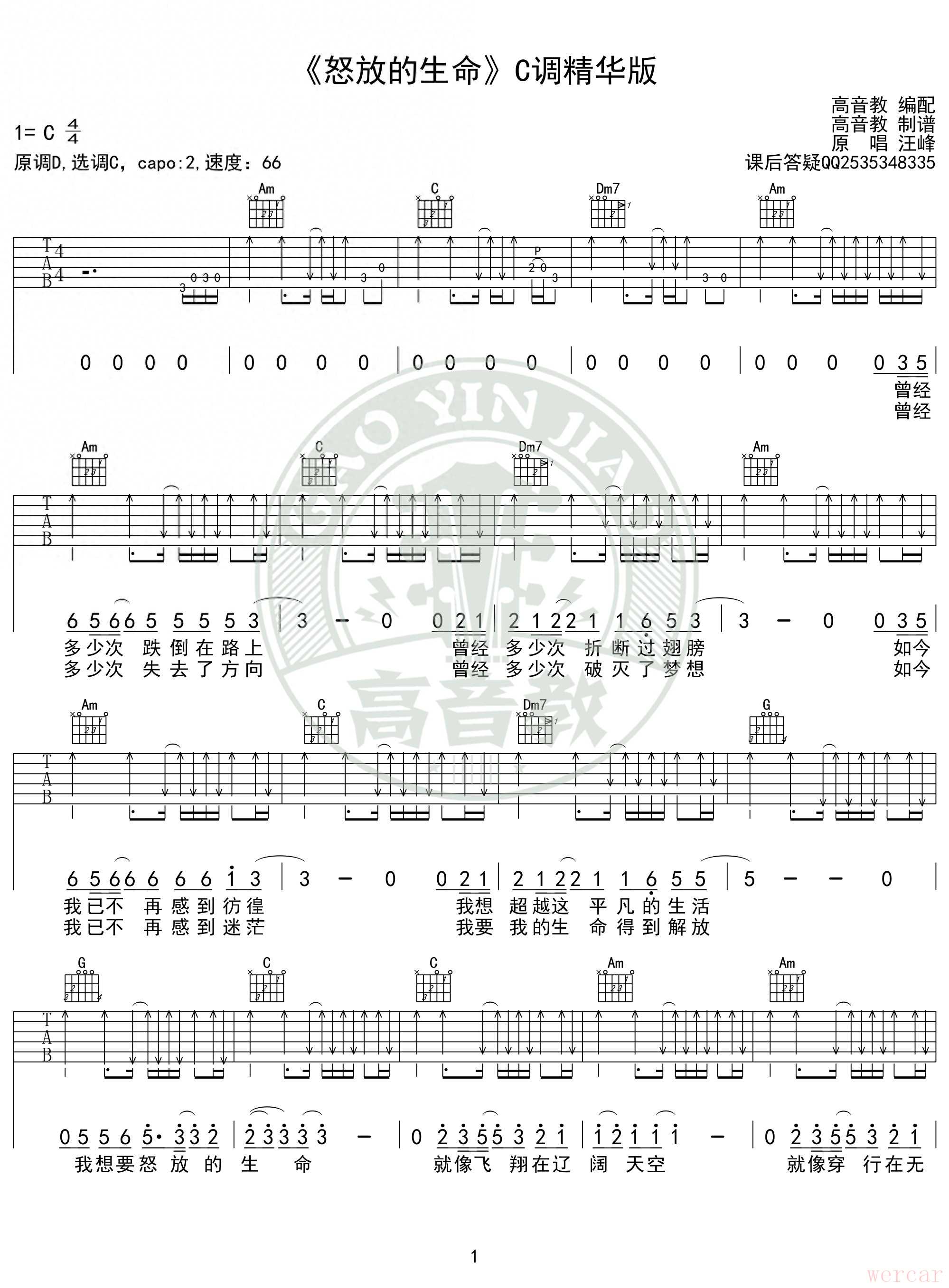 这是根据您的要求整理的《怒放的生命》吉他谱C调精华版,包含高音教学编排思路。请注意,由于“猴哥吉他教学”的版本可能略有不同,这里提供一个基于常见教学版本的简化精华版。