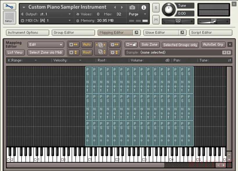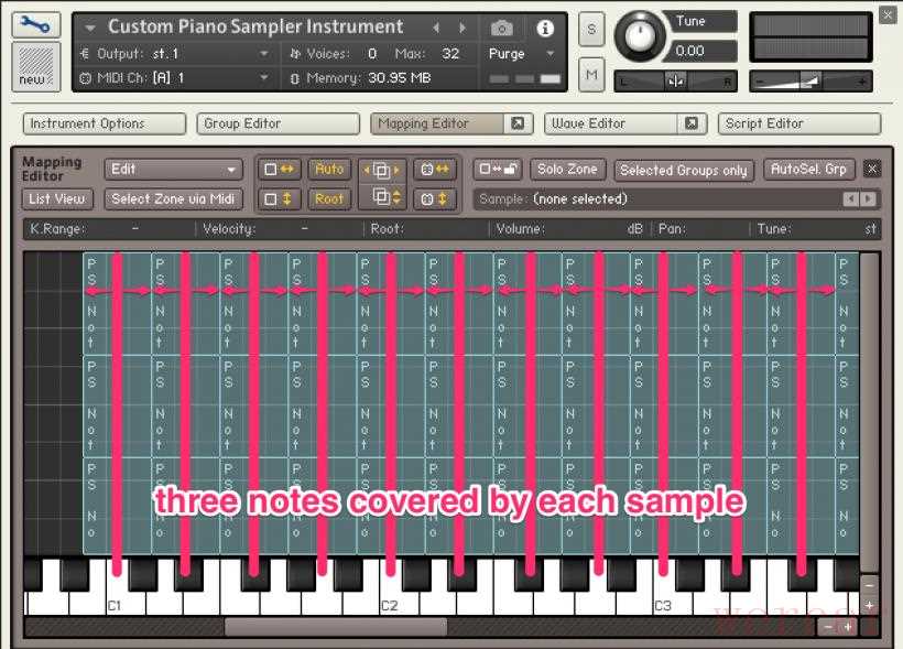 从上图中可以看到我总共录入了16个音符,每个音符带有3个力度,因此我实际一共只录制了48个声音样本。我将这些声音样本拖放到Kontakt的编辑器网格中,设置触发每个样本的音符和力度范围。