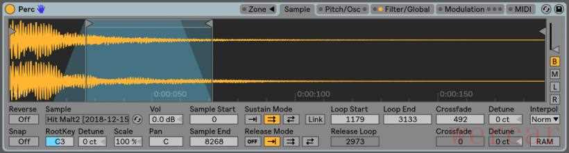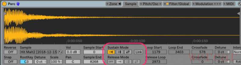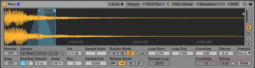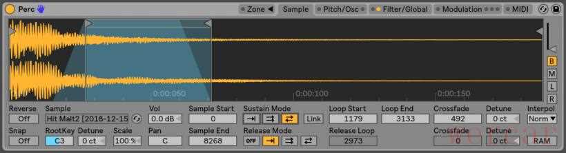 在Sampler中,我们可以为样本设置Sustain(保持)和Release(释放)模式。 基于MIDI输入,声音样本的某些部分将会循环播放。我将采样器设置为正常播放样本的初始瞬态。而后随着一个MIDI音符的持续发声,打击乐器的尾音被循环,这是通过交叉淡化来平滑的, 一旦MIDI音符结束,释放阶段开始,它将会播放循环后的剩余声音样本。