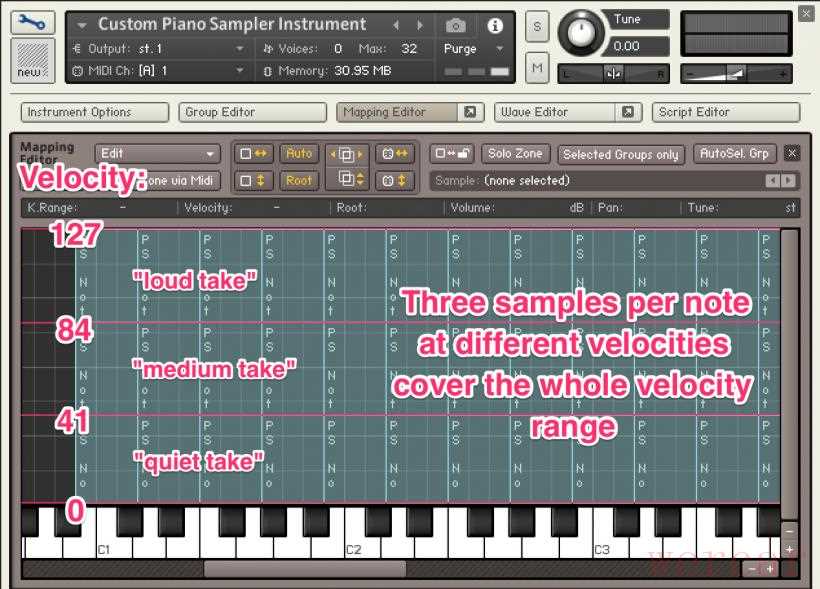 此外,我也不会为这127个音符去挨个录制不同的力度响应,因为其实很多商业采样器也都是通过调整声音样本的音量来诠释MIDI力度响应变化的。较低的力度只是把相同的样本调整得更安静,反之亦然。也就是说每一个音符我都只录下了安静、适中和响亮这三个音量级别的声音样本。我将速度范围1~127划分为三个相等的部分,并把每一部分分配到适当的力度范围中去。