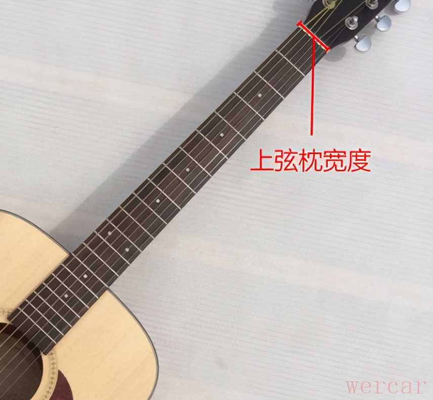 一般来说,指板的宽度取决于弦枕的宽度和指板末端的宽度,大部分吉他厂商只会标明弦枕的宽度(nut width)。电吉他大多是42-43mm,民谣吉他大多是43mm-47mm,古典吉他则要宽很多,常见的是48-52mm,这里我们重点分析一下民谣吉他不同指板宽度的不同特点。