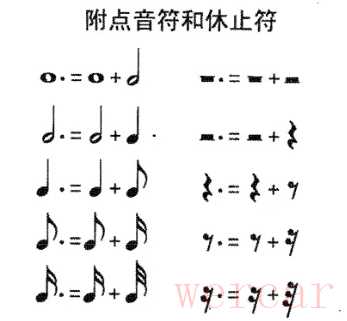 附点音符和附点休止符的原理与简谱一样,符点的时值相当于前面音符时值的一半。也就是说,音符或者休符的后面跟一个附点,其时值就延长一半。如果后面再跟一个附点,就将前面附点的时值再次延长一半。例如,如果一个四分音符的时值为一拍,其后带两个附点,那么第一个附点是半拍,第二个附点是四分之一拍,其总时值为一又四分之三拍。