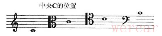 在高音谱表中,C音在下加一线,其余各音往上下推算;在中间谱表中,C音在第三线(中音谱号的中部三角尖所在的线);在次中音谱表中,C音在第四线上;在低音谱号中,C音在上加一线。