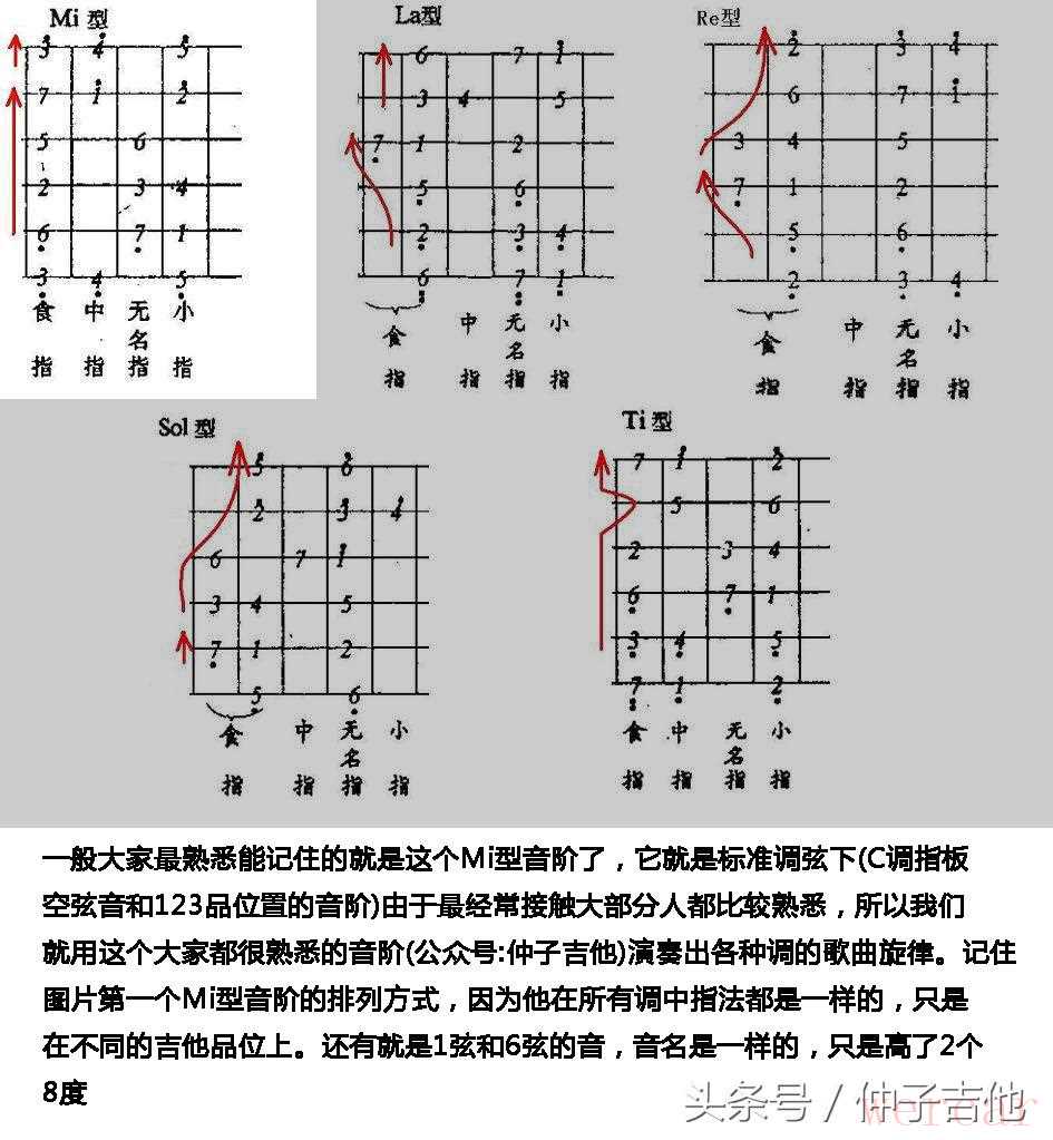 mi型音阶不是说就是属于哪一个调的,它是通用的。不是说这么多调的音阶全部都要练习一遍,把音阶指型弹熟悉,不同的调只是在不同的品位上演奏,指法是完全不变的,比如这个mi型音阶,指板整体往后移动7品,就是原本C调的空弦音在第7品位置,这时候mi型音阶就在7 8 9 10这4品的位置,这时你按mi型音阶指法弹,弹出来的就是G调旋律。第5把位就是F调,第二把位是D调。