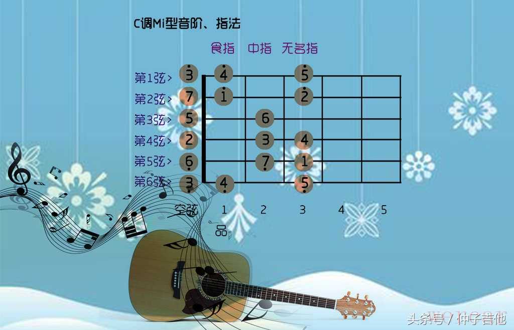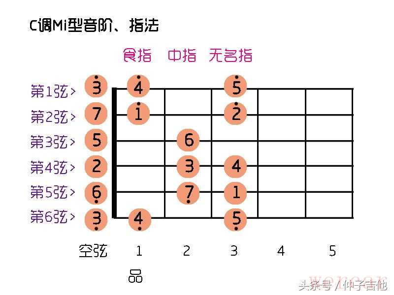 在C调中,mi型音阶的第一列的音在空弦上,空弦不用按弦,用手指负责第一品上的音、中指负责第2品上的音、无名指负责第3品上的音,不需要小指按弦。看下图C调mi型音阶、和指法