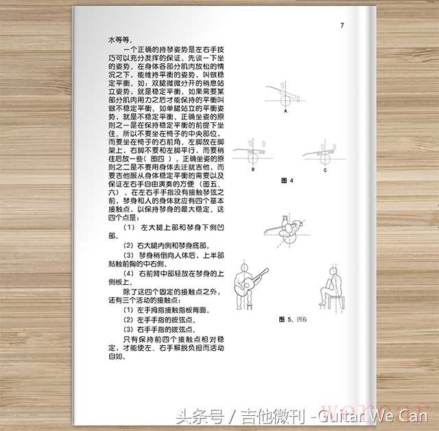 一个正确的持琴姿势是左右手技巧可以充分发挥的保证。先谈一下坐的姿势。在身体各部分肌肉放松的情况之下,能维持平衡的姿势,叫做稳定平衡。如:双腿微微分开的稍息站立姿势,就是稳定平衡。如果需要某部分肌肉用力之后才能保持的平衡叫做不稳定平衡。如单腿站立的平衡姿势,就是不稳定平衡。正确坐姿的原则之一是在保持稳定平衡的前提下坐住。所以不要坐在椅子的中央部位,而要坐在椅子的右前角。左脚放在脚架上,右脚不要和左脚平行,而要稍往后放一些(图④②)。正确坐姿的原则之二是不要用身体去迁就吉他,而要吉他服从身体稳定平衡的需要以及保证左右手自由演奏的方便(图⑤⑥)。在左右手手指没有接触琴弦之前,琴身和人的身体就应有四个基本接触点,以保持琴身的最大稳定。这四个点是: