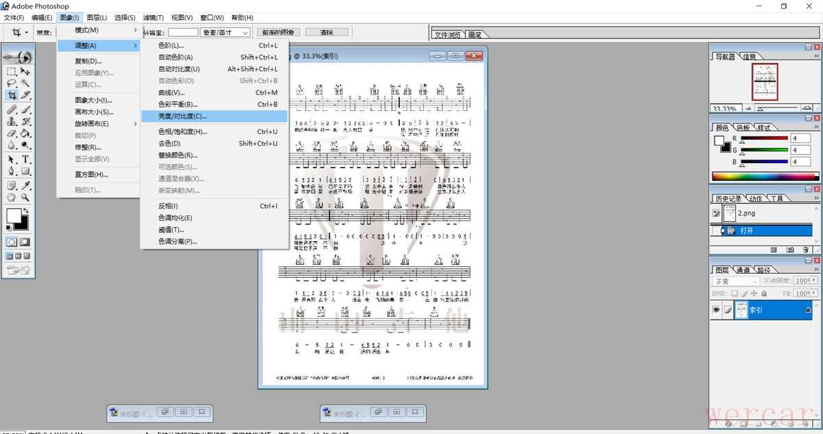 方法二:在电脑上用photoshop软件,ps的功能更强大,可以修改的功能更多,不但可以去水印,还可以修改清晰度、编辑修改谱子的错误等等。打开图片文件,点击“图像”菜单,打开“亮度/对比度”,拖动对比度及亮度滑块,直到最好效果,确定后保存。