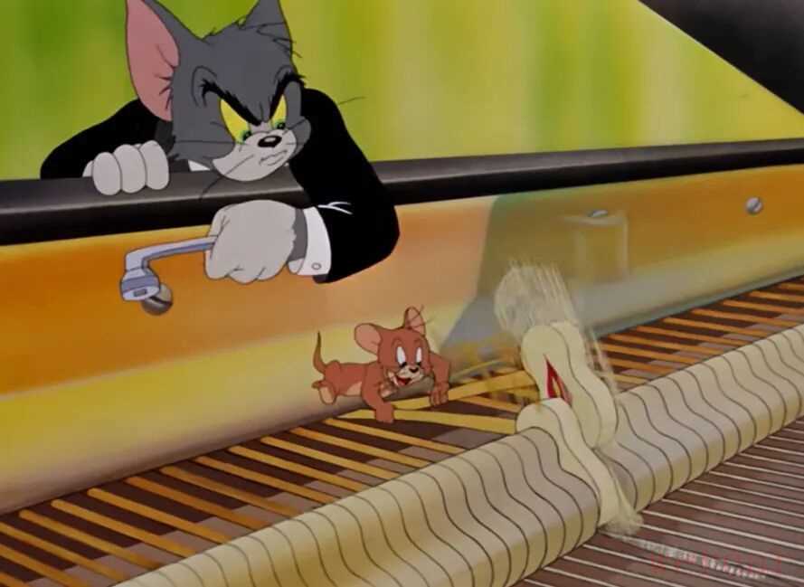 当杰瑞再一次开始捣乱,气愤的汤姆拿起钢琴琴身里的一个扳手,向杰瑞砸去。杰瑞立刻被砸晕了,汤姆终于又有了短暂的安心演奏的时间。可是,为什么会突然出现一个扳手,它和钢琴有什么关系呢?