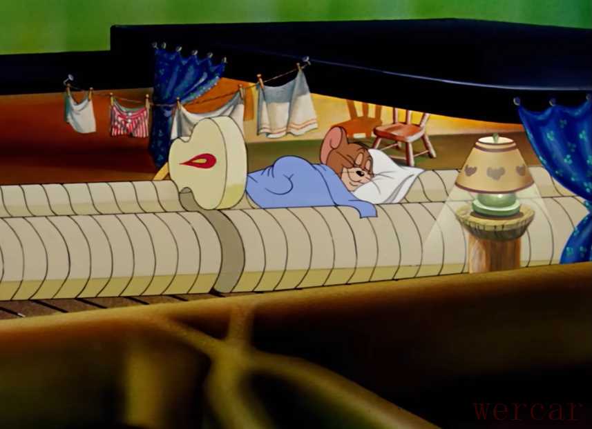 故事的开始,汤姆按下琴键,触发琴槌,惊醒了睡觉的杰瑞