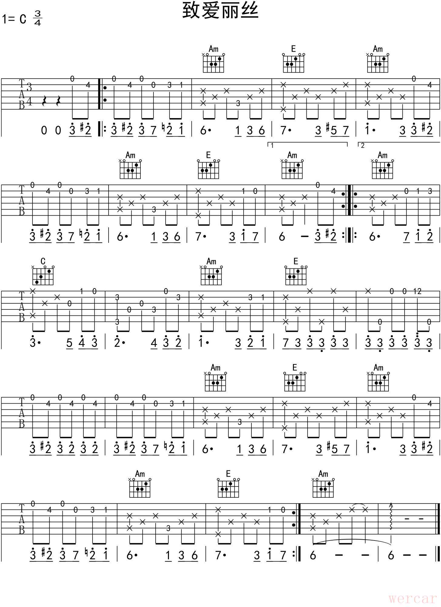 这是《致爱丽丝》的民谣吉他独奏谱,适合二级进阶水平。这个版本采用了分解和弦伴奏,并在旋律部分使用了相对简单的指法,适合练习指弹(Fingerstyle/Pickstyle)技巧。