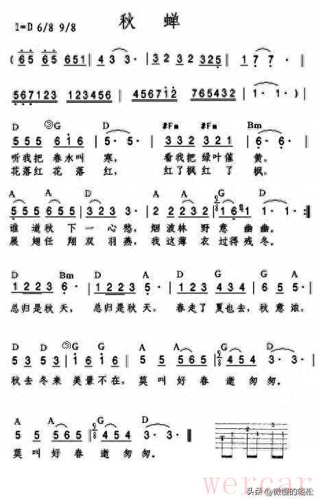 以下是一个基于《秋蝉》的吉他弹唱曲谱,调性为1=D(D大调),和弦编排为h=d2。请注意,这只是一个参考版本,您可以根据自己的喜好进行调整。