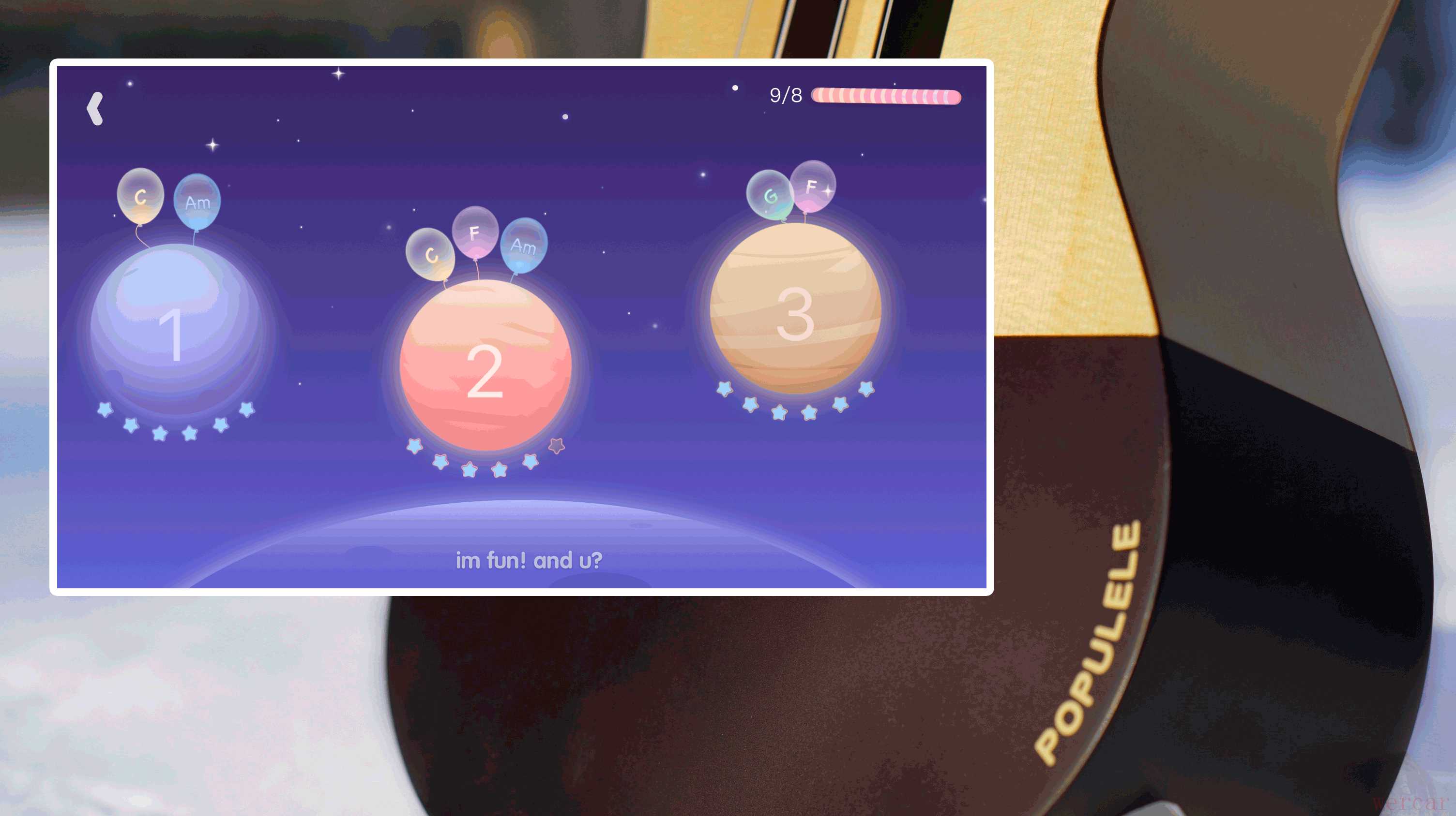 游戏模块里共有九个关卡,每过一关才能解锁下一个关卡,对于新手练习来说,每一关从容易到复杂也是不错的,包括最常用的和弦C,Am,F,G以及Em。其实学会上面这几个和弦就能简单的弹奏很多歌曲,但是由于和弦缺乏变化性,相对来说还不算特别的好听,不过要是学会这四个和弦并且弹奏一整首歌曲也是满满的成就感啦。这个游戏部分希望能增加更多的基础和弦的切换以及基础扫弦方便用户更好的学习弹奏尤克里里。