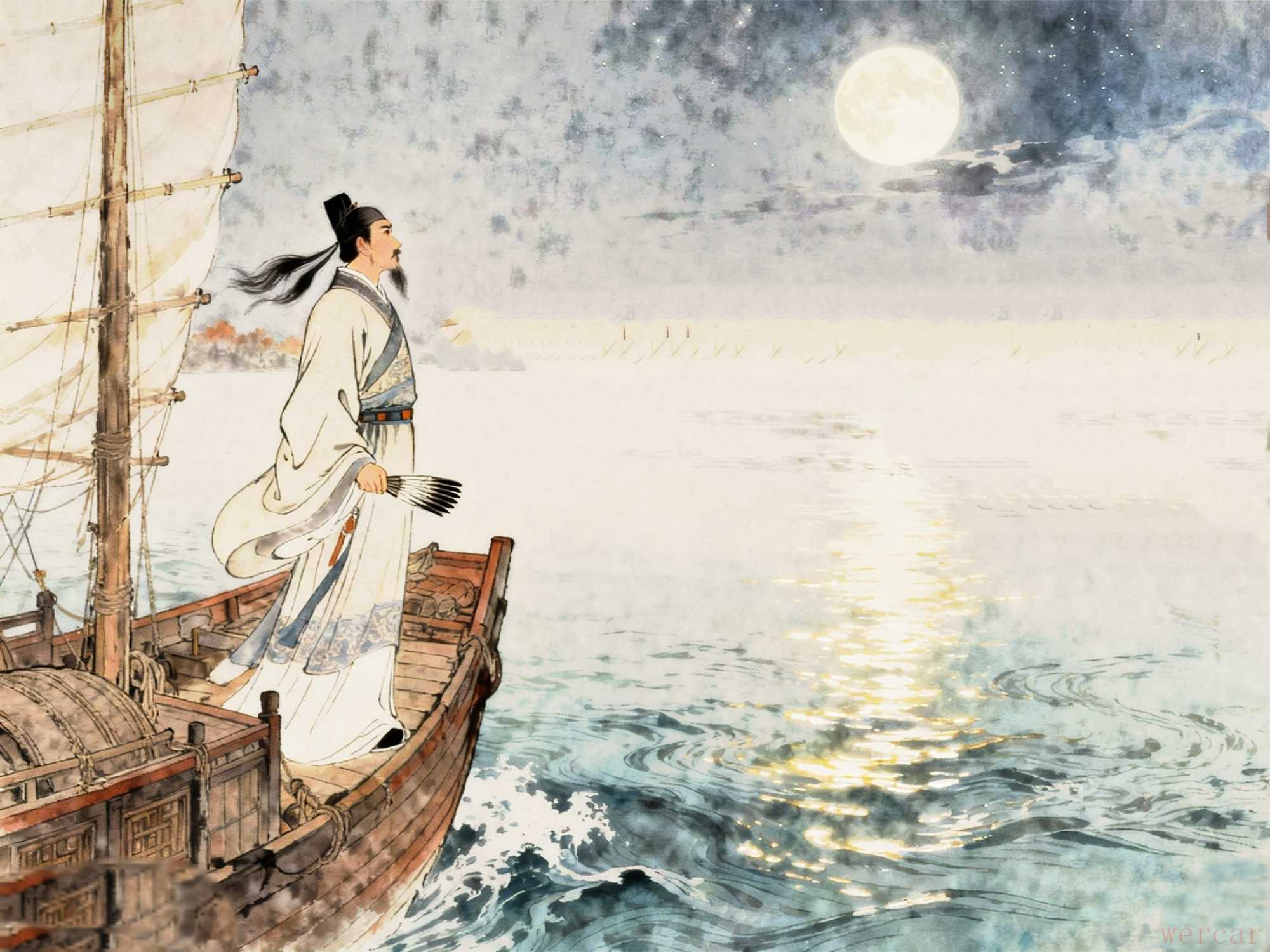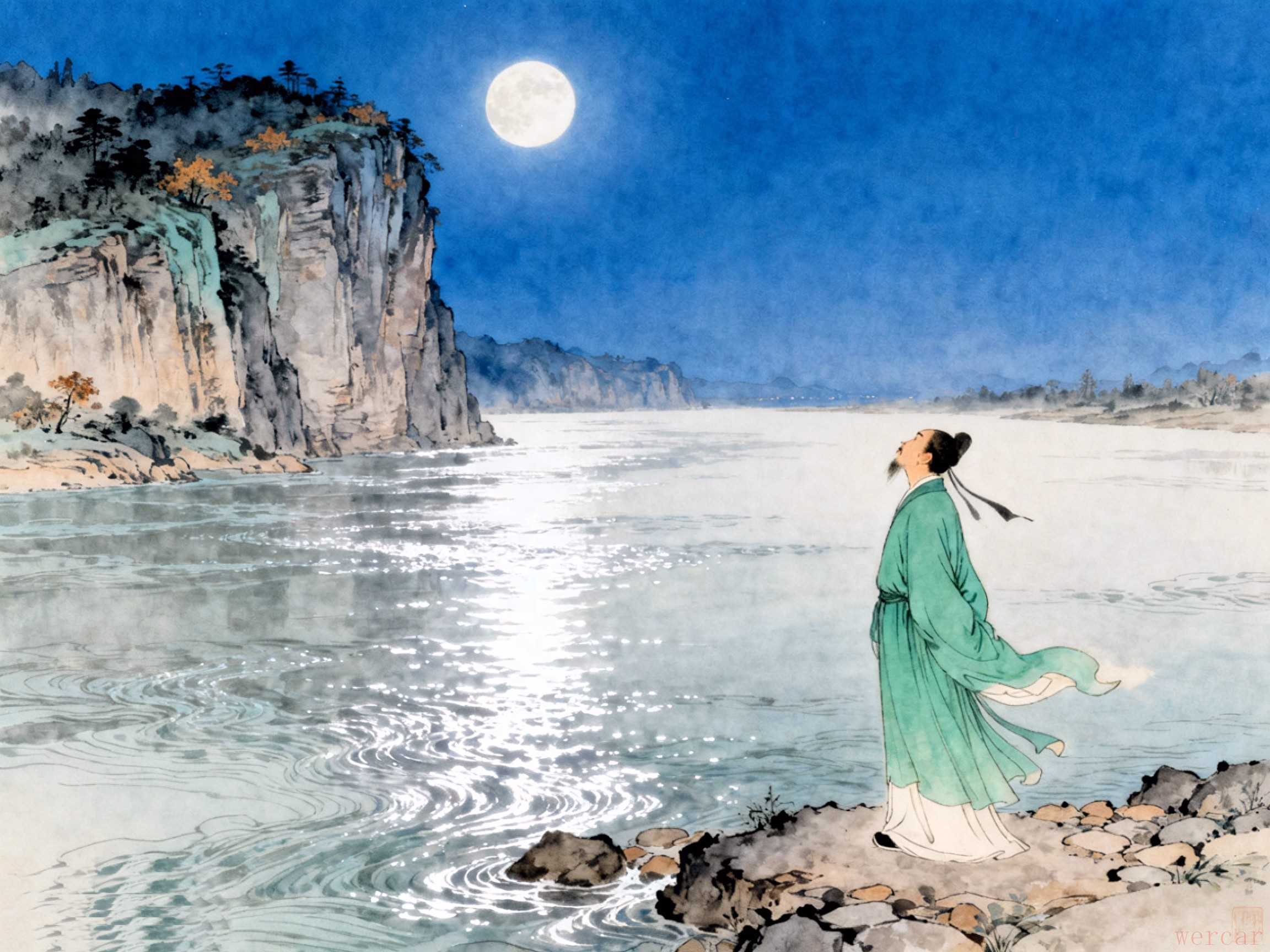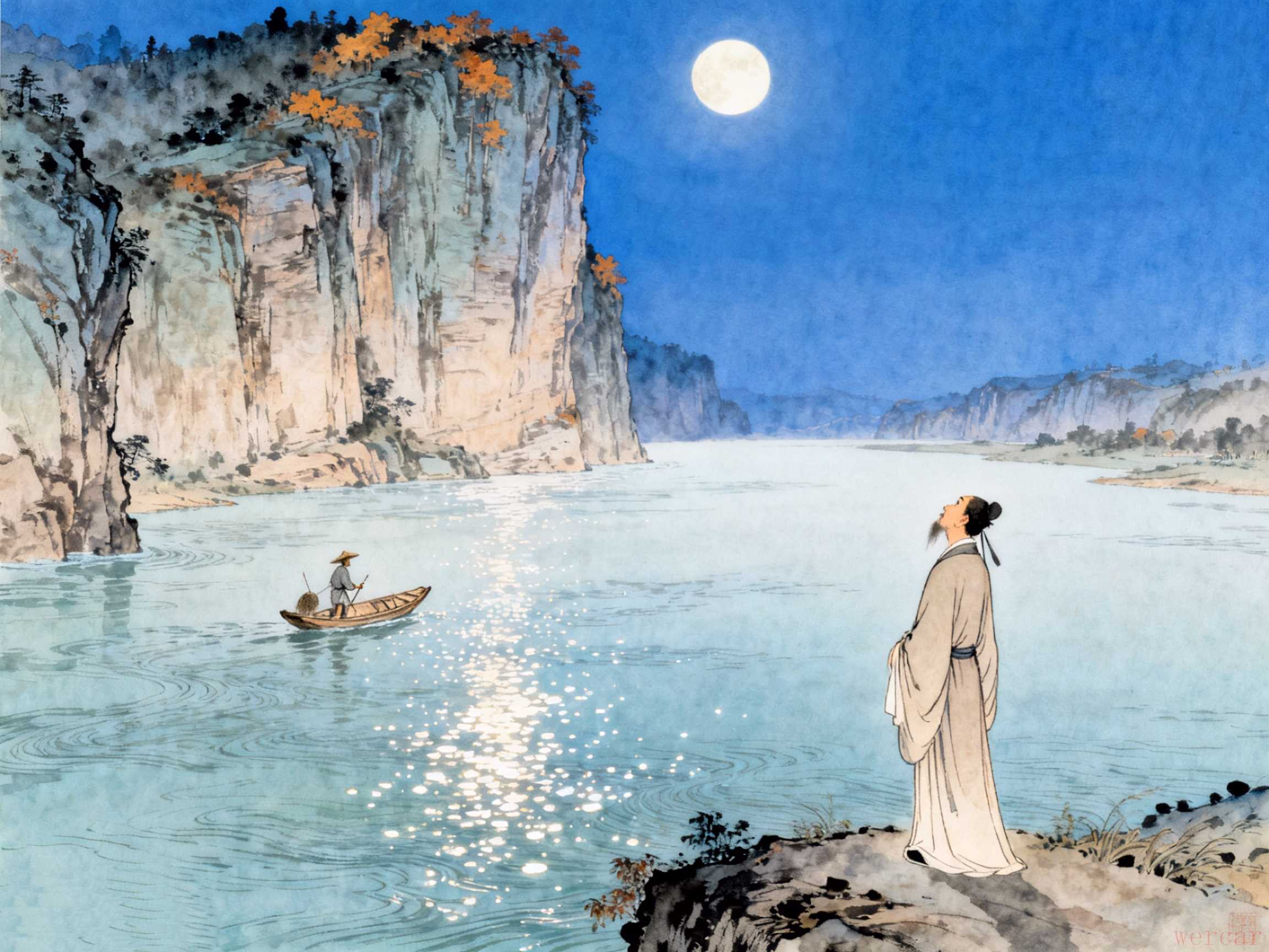 “月明渔父唱沧浪”:在这样一个宁静的夜晚,江上出现了打渔的老人。他唱的《沧浪歌》源自《诗经·